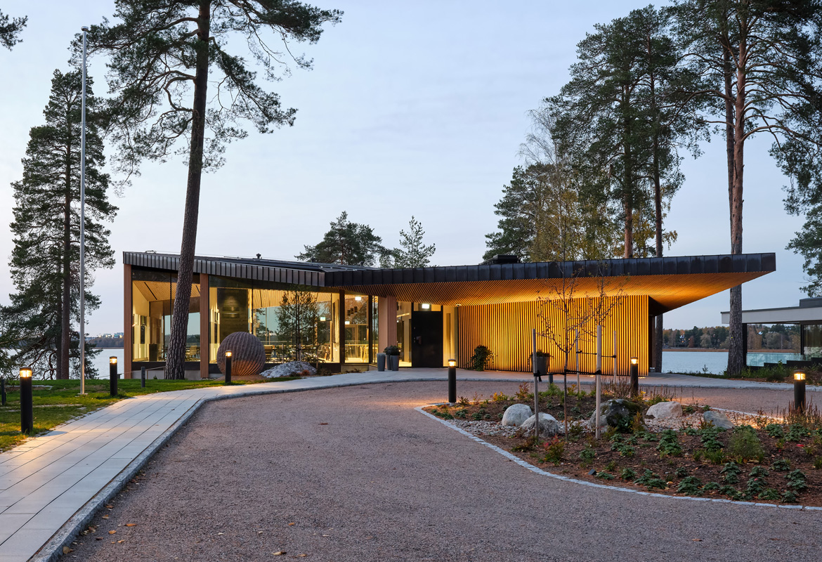 The architecture, functional solutions and structures of the building are designed to withstand time both technically and visually. The slightly inwards sloping roof shelters the main entrance, which leads to the central lobby that runs through the length of building. Around this, the four innovation spaces can be closed off or flexibly combined and furnished for various uses, whether interactive and collaborative work or for separate events. All rooms open to views of the garden or sea through wide terraces or glass walls. The sauna and meeting premises on the lower level have direct access to the seashore.