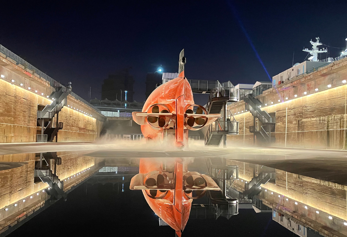 In the first phase, the exhibition is organically integrated with the existing dock to create a powerful architectural experience. The interior of the submarine is set up for visitors to immerse themselves in the experience of working and living in a submarine. The waterscape design at the bottom of the dock presents a gradually undulating terrain and changing water levels to suggest the historical appearance of the dockyard. The design reveals and hides the convex and concave polished concrete surfaces, inviting visitors to walk around and play in the constantly circulating water of the pools