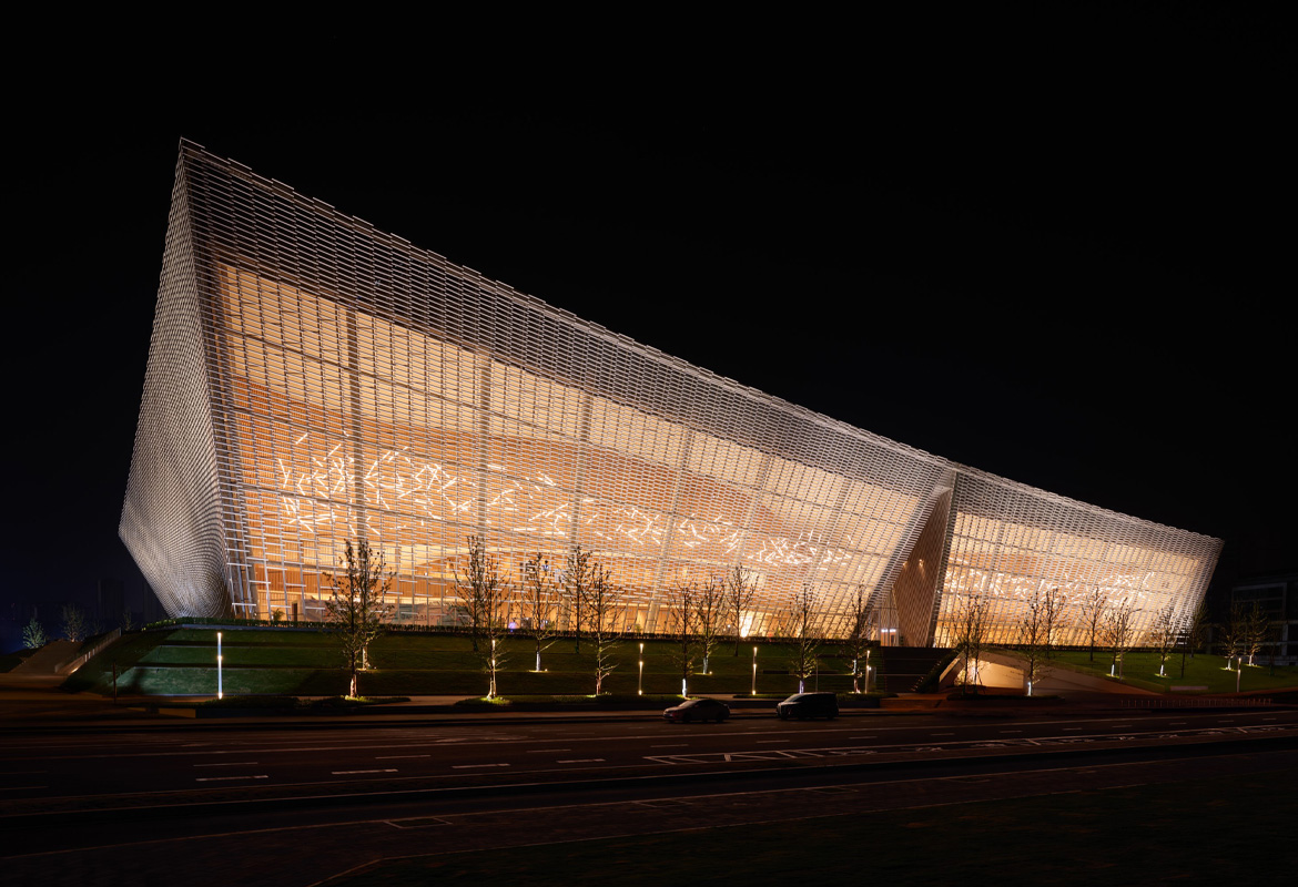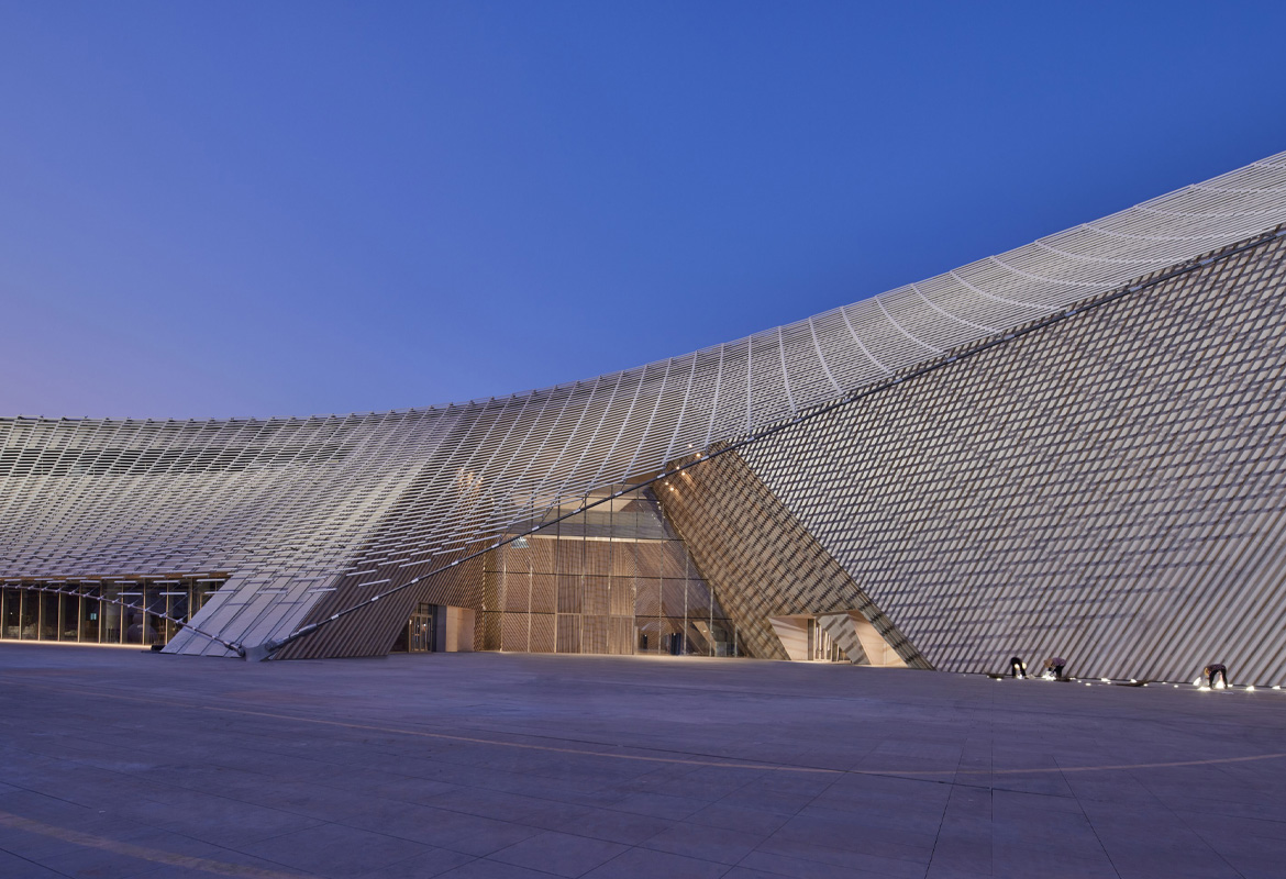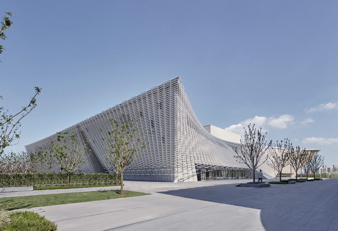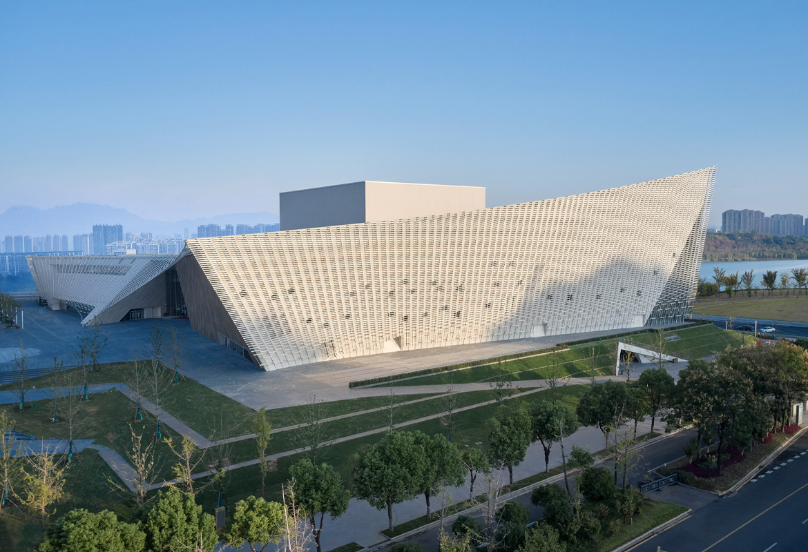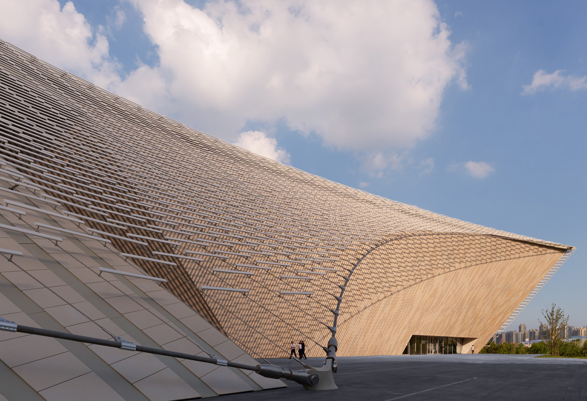 The building's design extensively incorporates ceramics and bamboo, renewable materials deeply rooted in Chinese tradition.The building is enveloped by a striking, airy 'veil' of China White ceramic louvres, inspired by the region's translucent rice porcelain. The bold, double-curved surfaces are based on advanced structural modelling and supported by steel cables. The pixelated ceramic facade shields the building from the sun while offering glimpses into the interior with its contrasting terracotta and bamboo finishes.