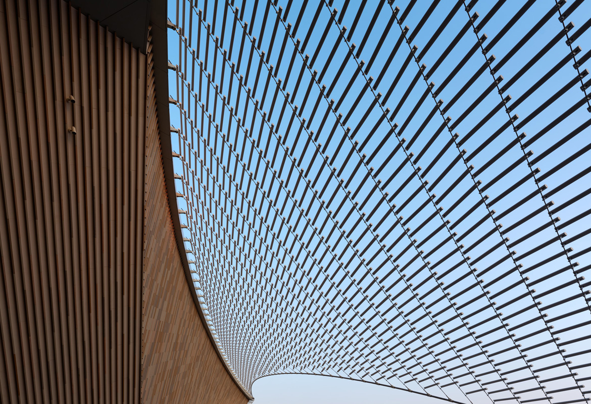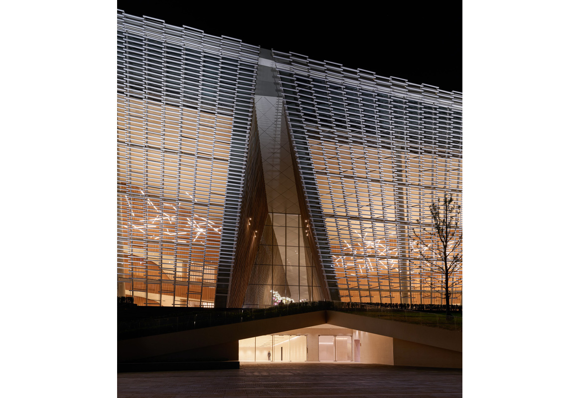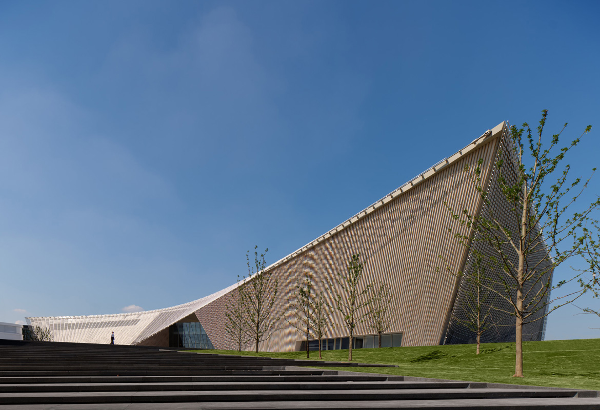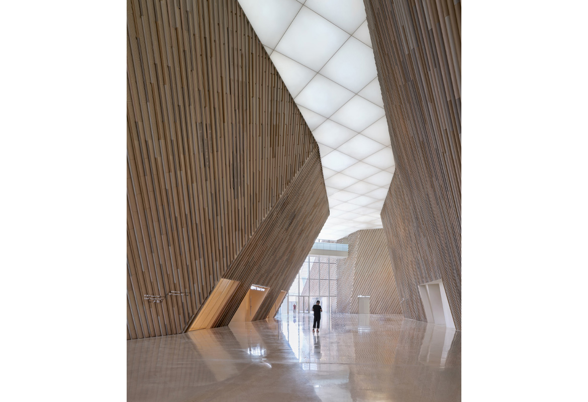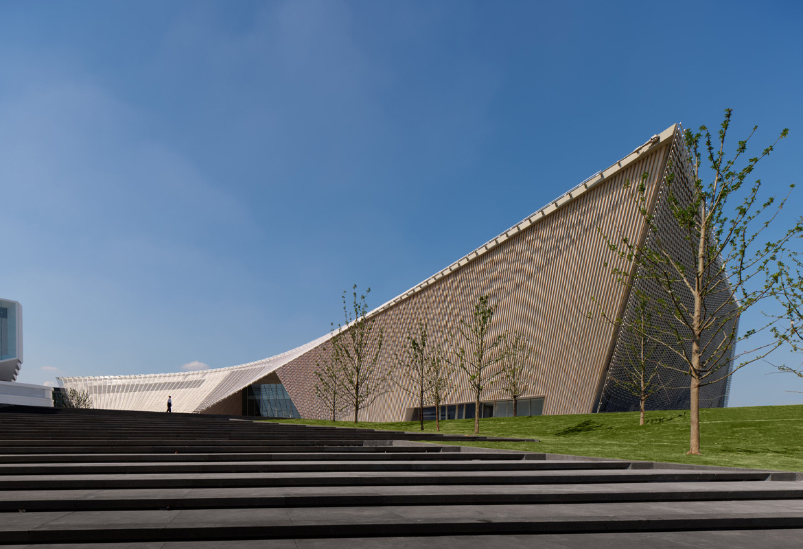 The building's design extensively incorporates ceramics and bamboo, renewable materials deeply rooted in Chinese tradition.The building is enveloped by a striking, airy 'veil' of China White ceramic louvres, inspired by the region's translucent rice porcelain. The bold, double-curved surfaces are based on advanced structural modelling and supported by steel cables. The pixelated ceramic facade shields the building from the sun while offering glimpses into the interior with its contrasting terracotta and bamboo finishes.