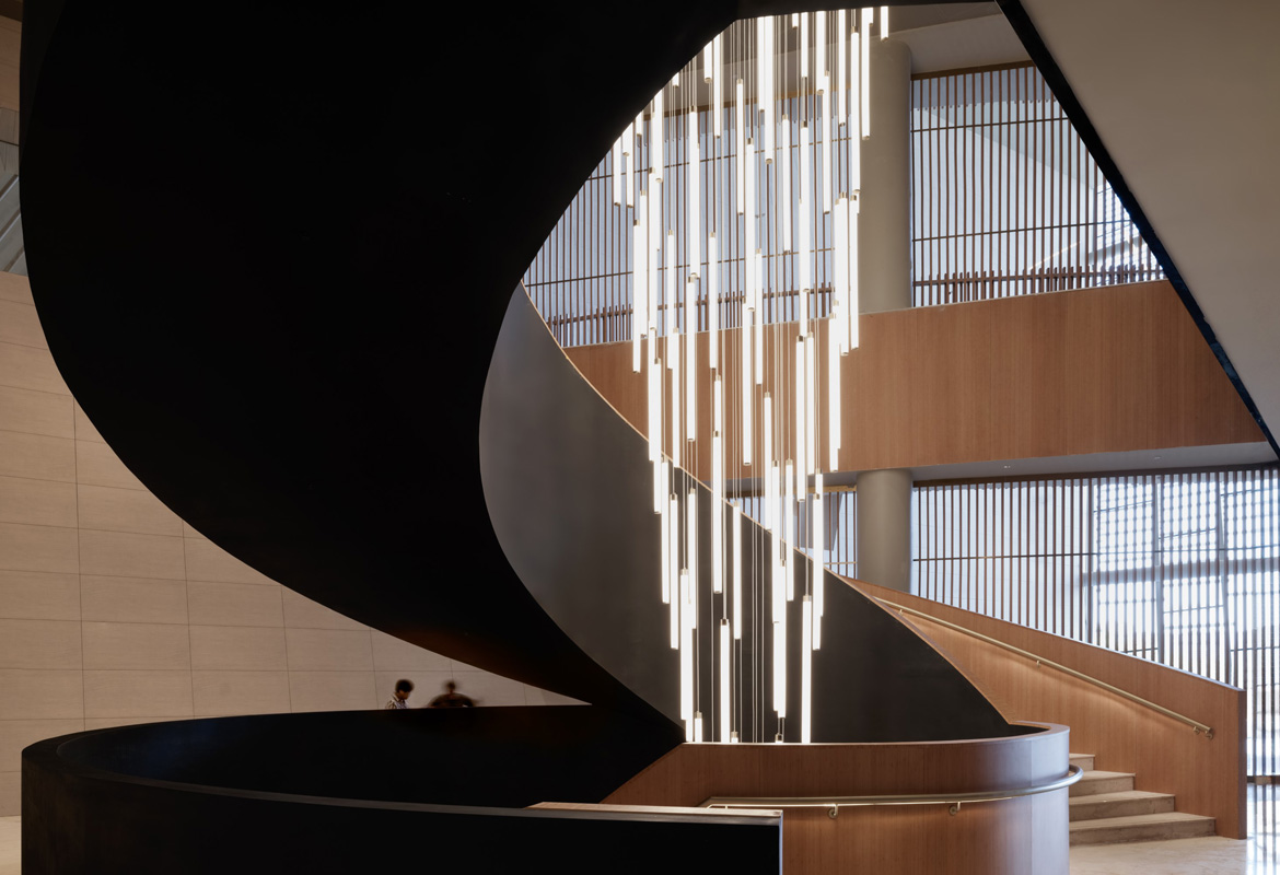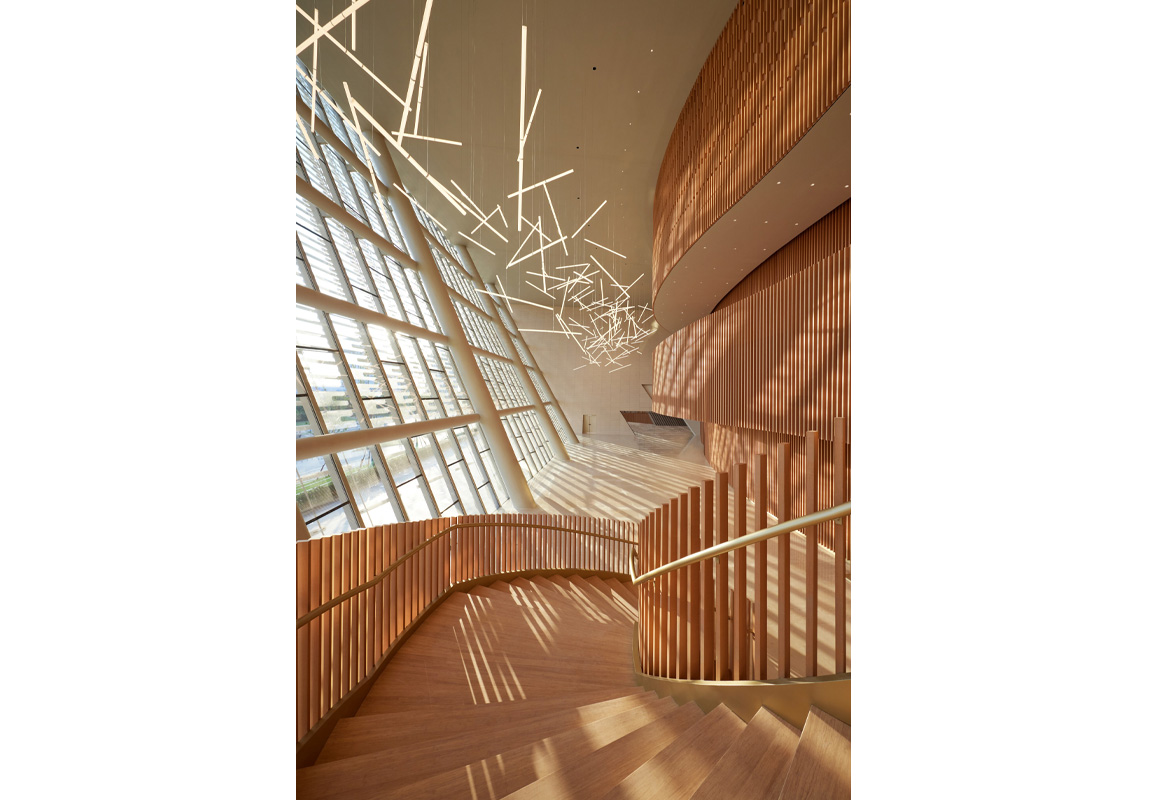 The formal main entrance plaza and main pedestrian entrance open to the south, while the northern entrance connects to the commercial area. The expansive roof canopy above the main entrance and the large outdoor auditorium form an active urban focal point.Once the adjacent office and retail complex is completed, the area will form an intertwining network of various functions, buildings, plazas and green spaces, integrating commerce and culture.