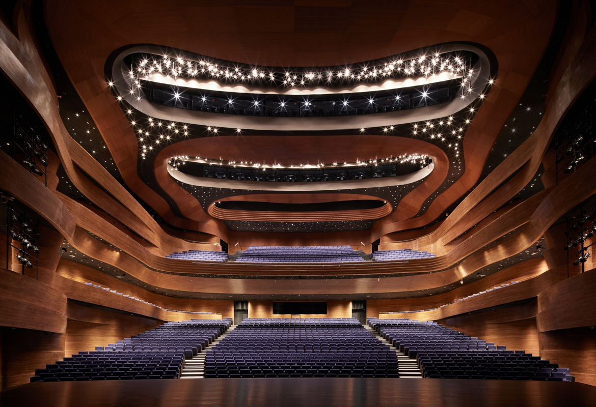 The theatre foyers and main performance spaces are clad with fireproof stained bamboo, while flooring materials include natural stone and strand-woven bamboo.