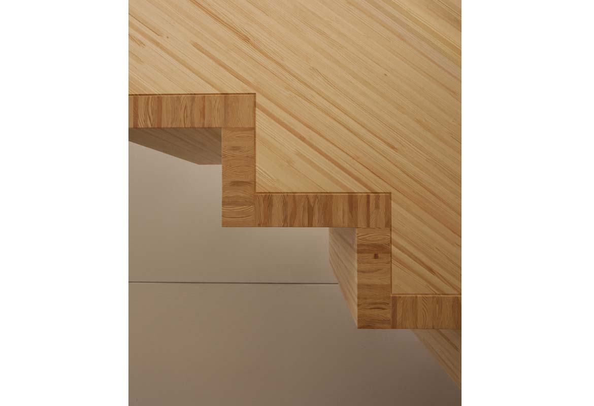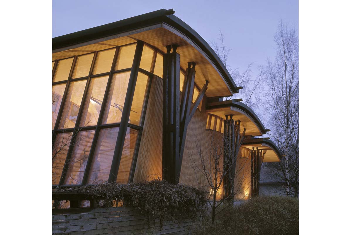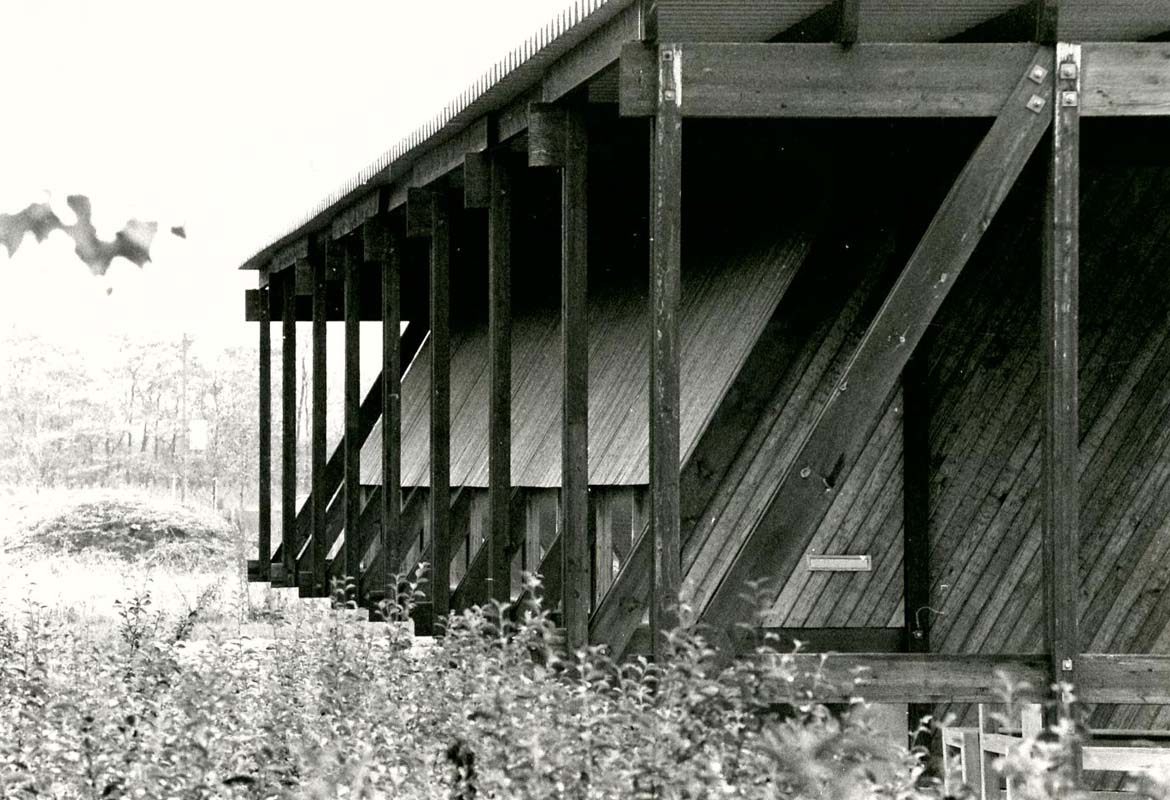 The appearance of the facades and interior of the original building is based upon a simple wood frame construction system based on glued-laminated columns and beams. The raked façade is protected by overhanging eaves, with a terrace at each end of the building in the last column bay. The flexible furniture system designed for the building is still in use.Atelier apartment 1987