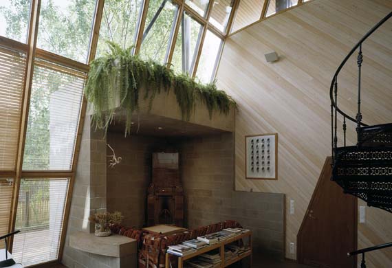 The northeast-facing atelier features a high inward-sloping window, whereas the kitchen/meeting room has an outward-sloping window linking the interior to the walled garden.