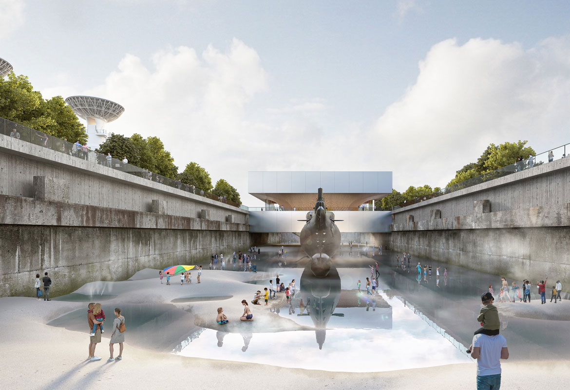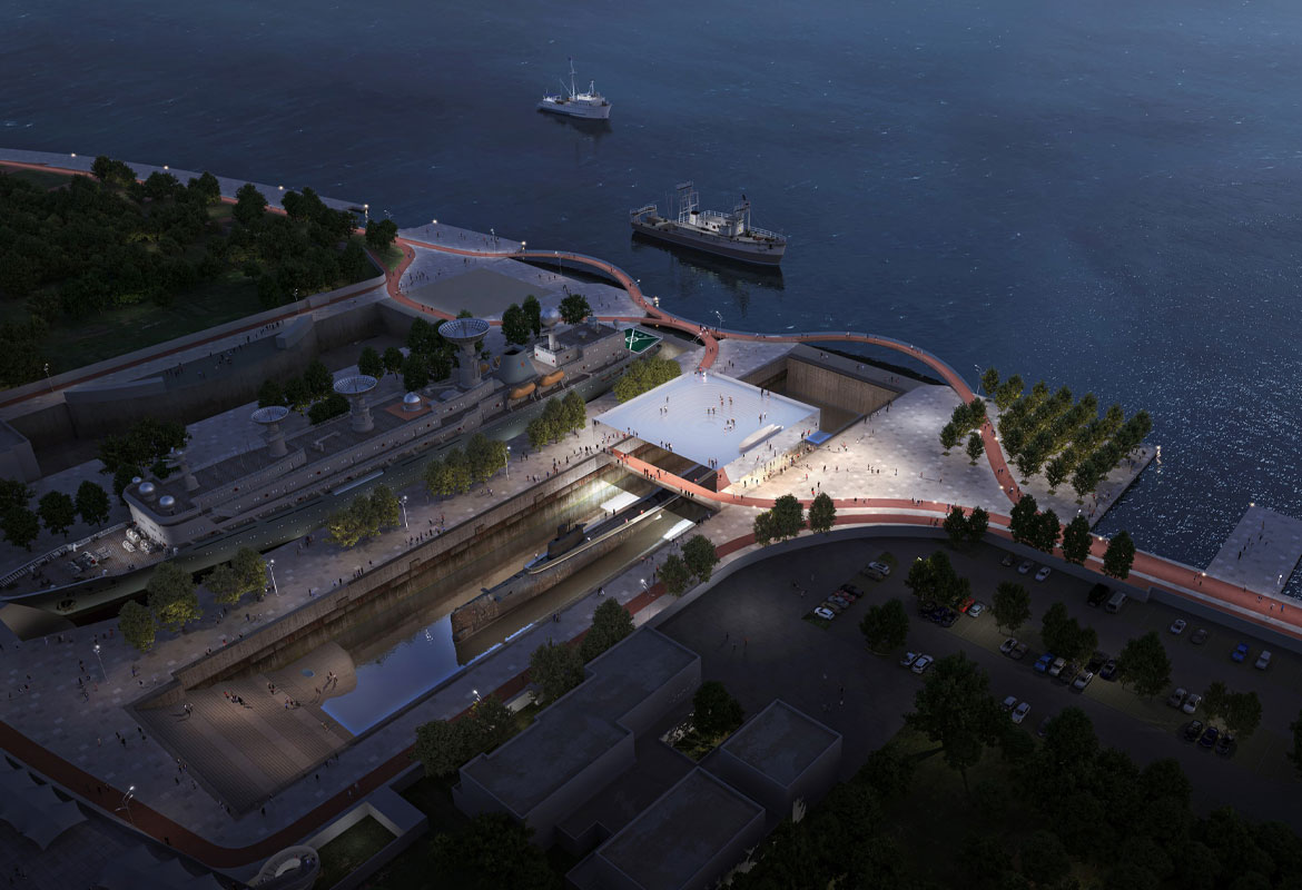 The site for the future museum and the relocated submarine is one of three adjacent maritime docks. The design takes advantage of the historic industrial spaces and repurposes them for new uses while preserving the atmospheric quality of the location.