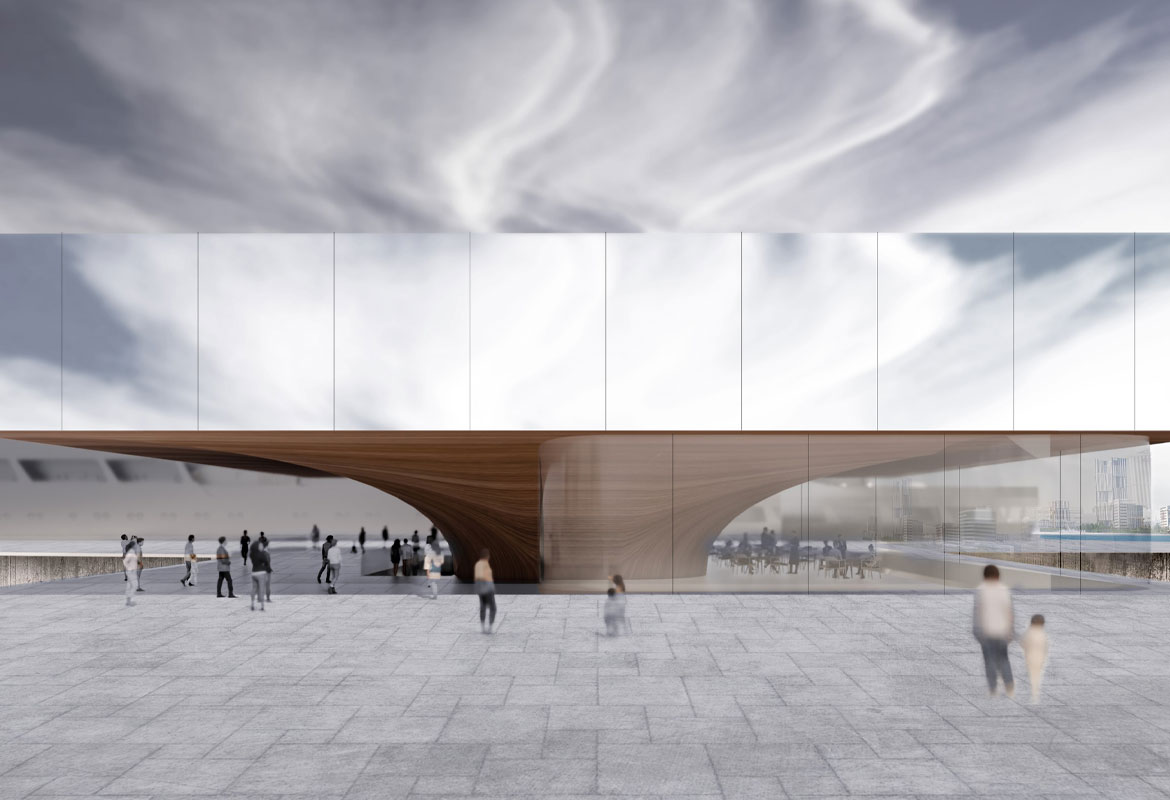 Concealing envelope The reflective mirror facade simultaneously amplifies its context and disappears, attracting attention while respecting its environment. Glass, steel and wood form an elegant contrast to the rough textures of the museum dock.