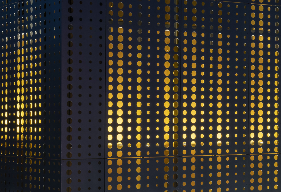 The metal sheet cladding and glass surfaces of the facades of both entrance pavilions are printed with graphic patterns resembling the reeds and grasses of the wetland. Inside, the grass theme is strengthened by the greenish tint of the glazed concrete surfaces.