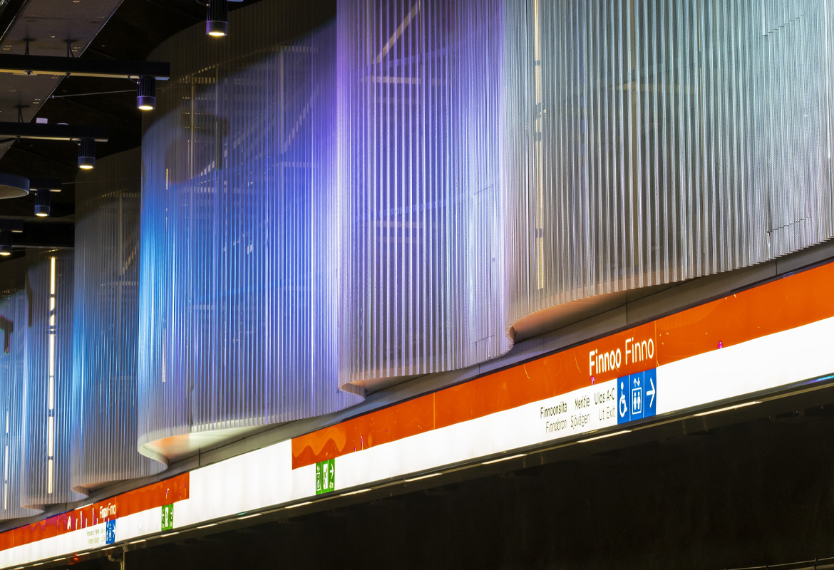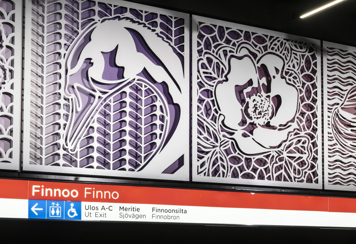 The underground platform has a distinctive, asymmetrical appearance. The undulating, green-blue metal cladding on the southern platform wall symbolises the sea, shore and wetlands. On the opposite wall, Leena Nio's work “Haavekuvia” (Dream images) features a marine theme, depicting details of the seaside cut into an aluminium sheet in a lace-like pattern.