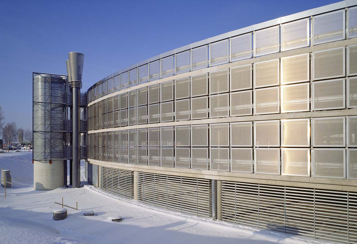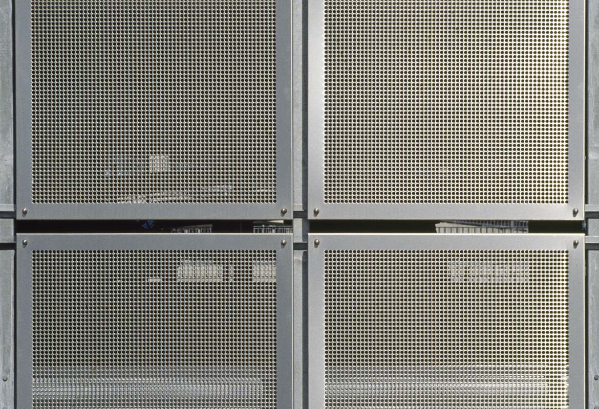 The exterior of the parking halls are clad with brushed, perforated, stainless steel cassettes which are 50% open. The facade was designed to be an airy, vibrant surface, a steel skin which changes its character in different lighting condition.