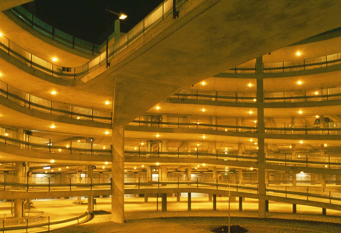 On approaching the Helsinki Vantaa Airport terminal area, the two unique round steel and concrete car parking halls come into view as two low laying, gently curving steel-clad disks. From the outside the 2 parking halls are almost identical only the subtle differences of one being in-situ caste and the other being fabricated from elements showing the 15 year age difference between them. Both parking halls are 7 storey’s in height, 4 storey’s are below ground, 3 being built into the bedrock and only 3 floors are above ground allowing the surprisingly large parking facility to be situated as close as possible to the terminal without unduly disturbing the surroundings.