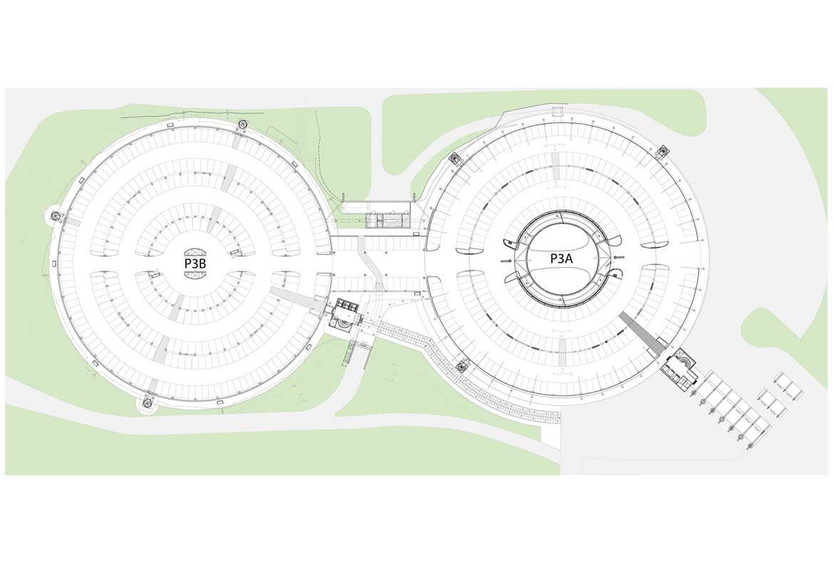 The original P3A parking hall has 2025 parking spaces and can be distinguished by the round void in its centre which allows natural light to reach every floor and for the curve ramp to connect each floor. The new P3B hall contains 2400 parking spaces and includes the new linking bridge joining the two halls together.