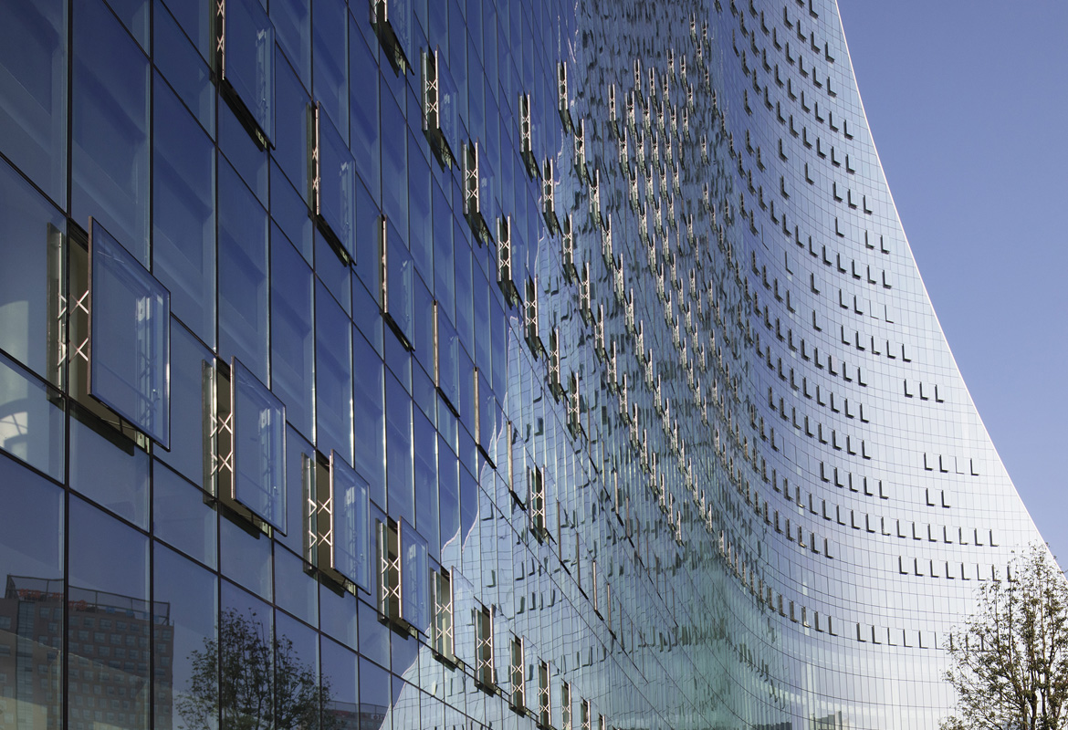 During the design process, what was originally planned as an office tower evolved into a versatile, mixed-use building complex. A shopping centre occupies the first two levels of the 47-storey building, while the third and fourth floors feature restaurants. A conference centre spans the fifth floor, followed by 23 floors of offices and 13 floors reserved for an apartment hotel. The top three floors contain dining, reception and meeting areas. The roof features a helipad.