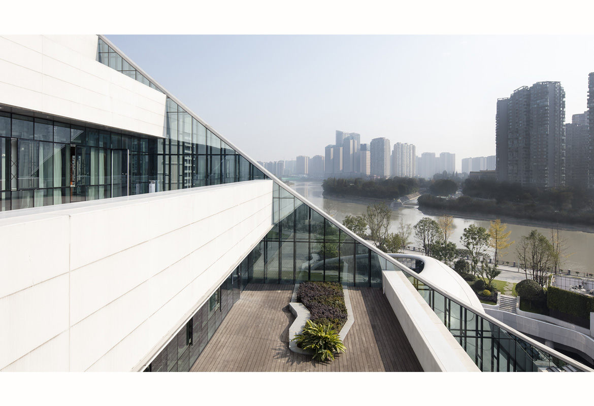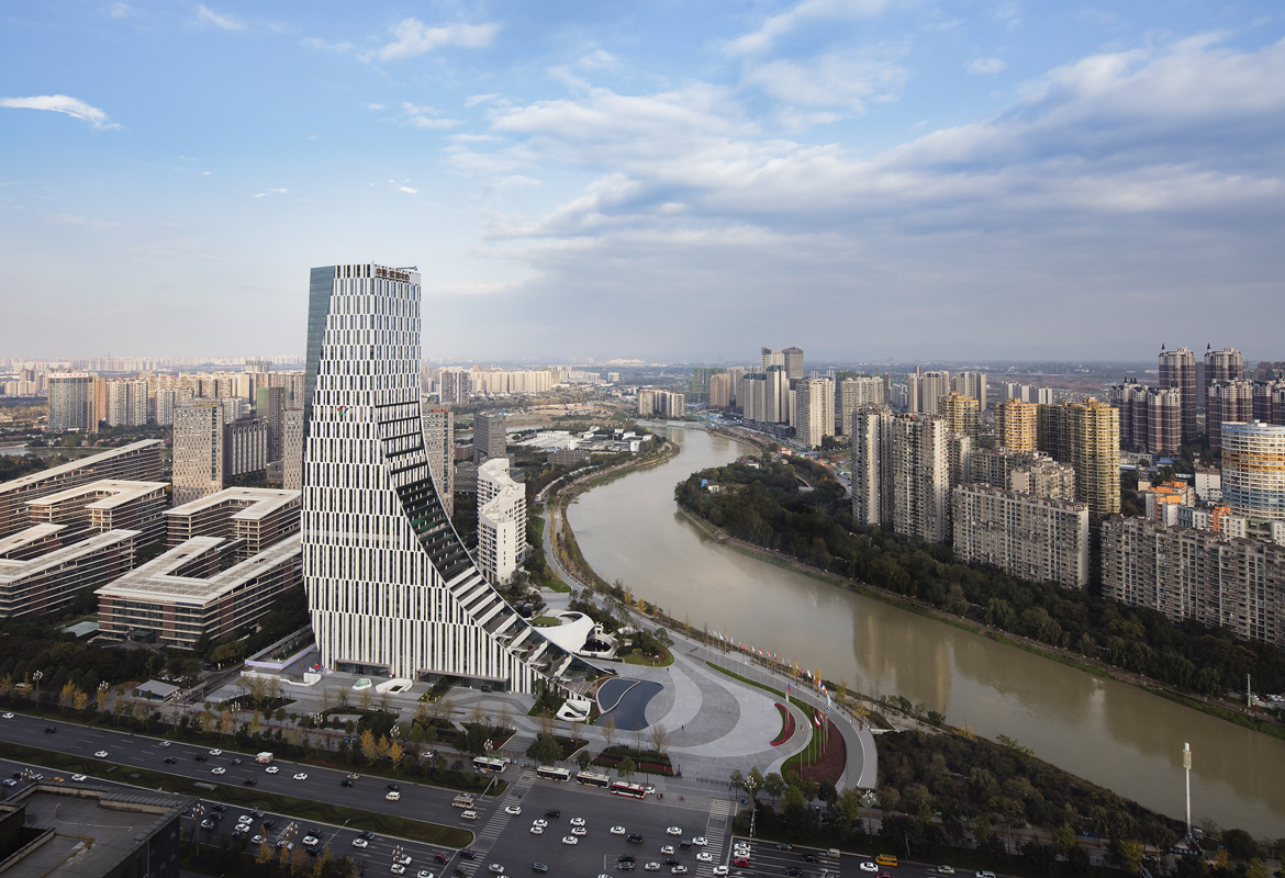 The tower has an L-shaped plan at ground level that grows into a square towards the top. This form creates a sweeping façade that overlooks the Tianfu River and a straight edge that defines the corner of the site along Tianfu Avenue. The curved elevations to the south and east are defined by green terraces up to the 30th floor. Glass and glazed ceramic elements form a checquered pattern on the other facades.