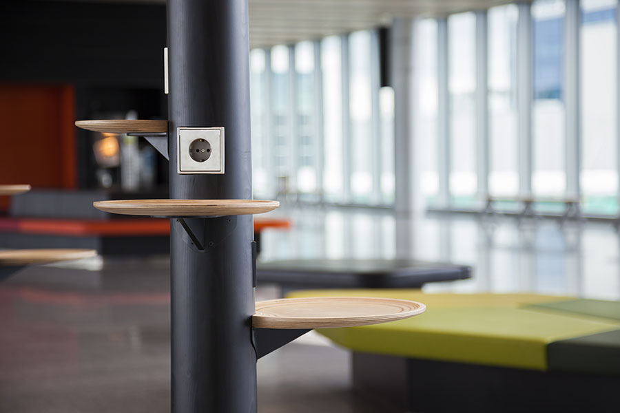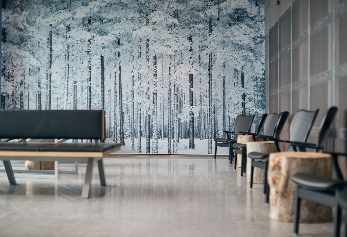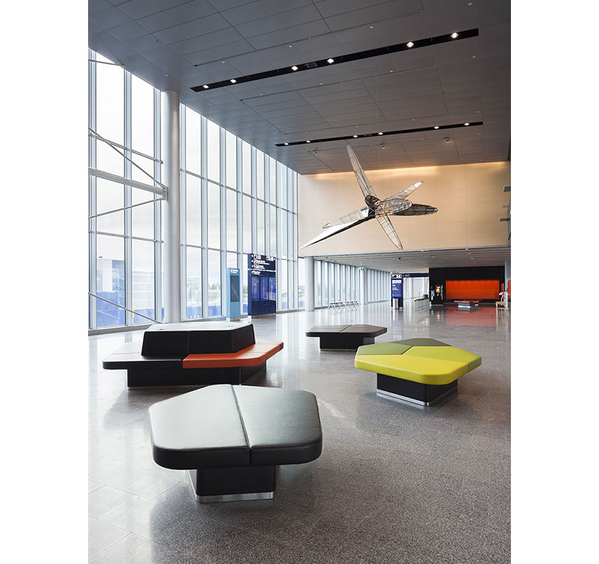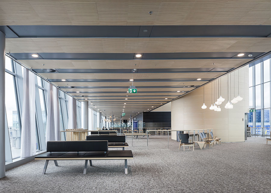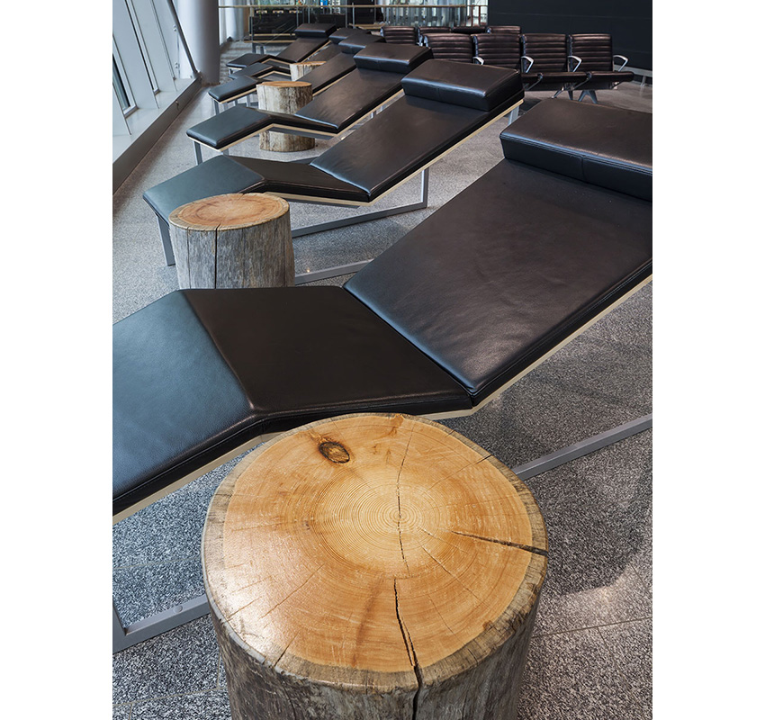 As passengers may need to spend a long time at the airport, the aim was to design comfortable spaces with places to relax and unwind. The use of birch wood brings warmth and a cosy feel to the large public spaces. Special furniture was designed to cater to travellers’ needs, including lounge chairs and wooden electronics charging stations.