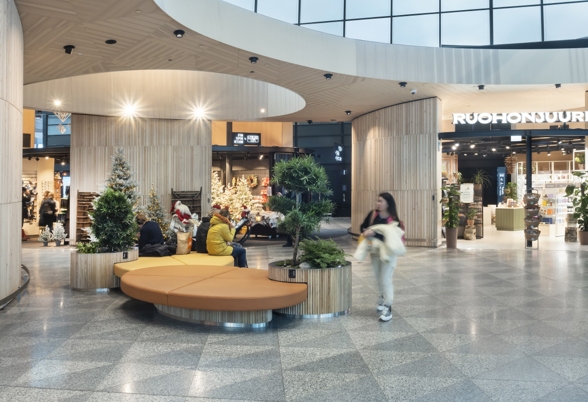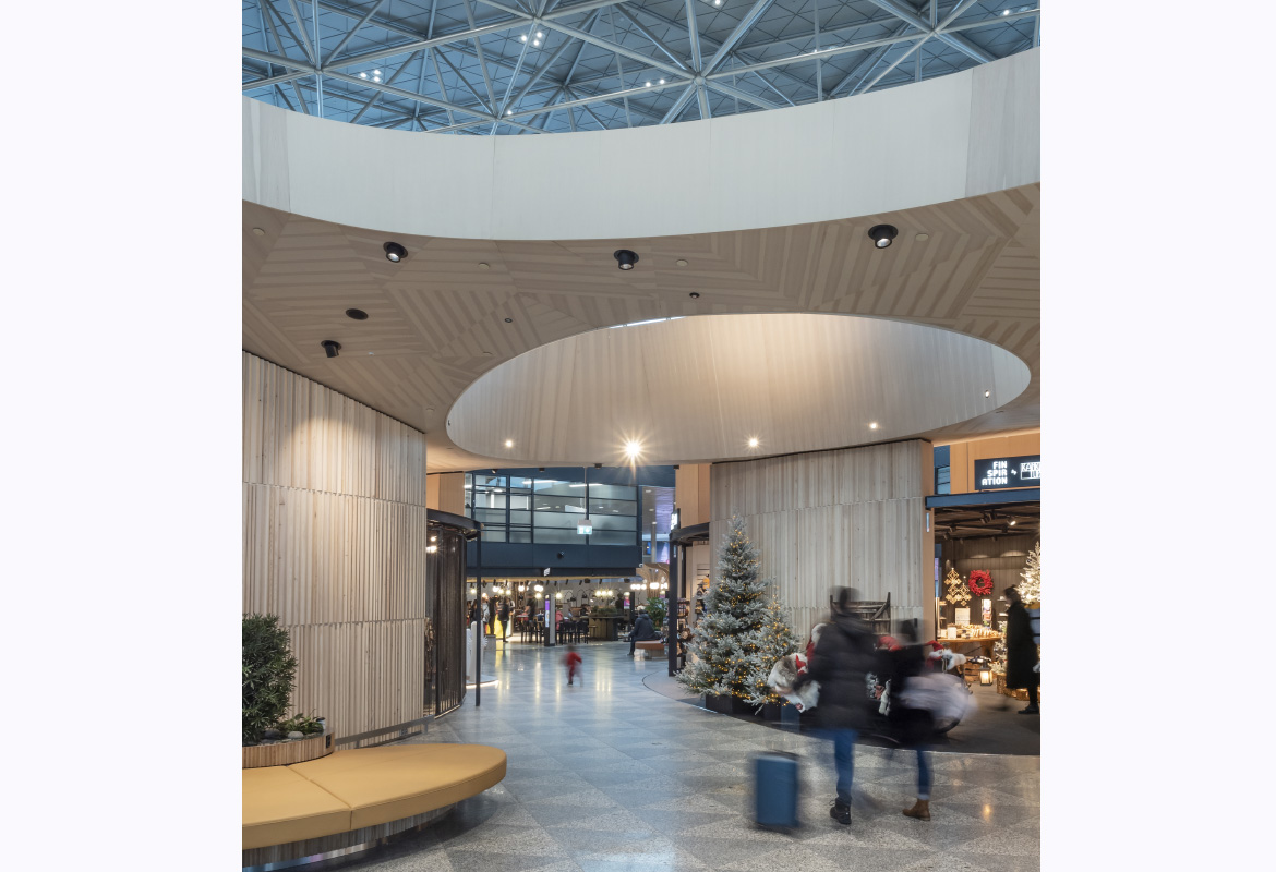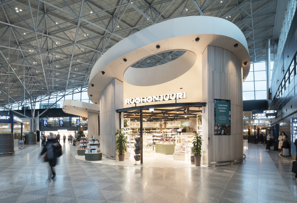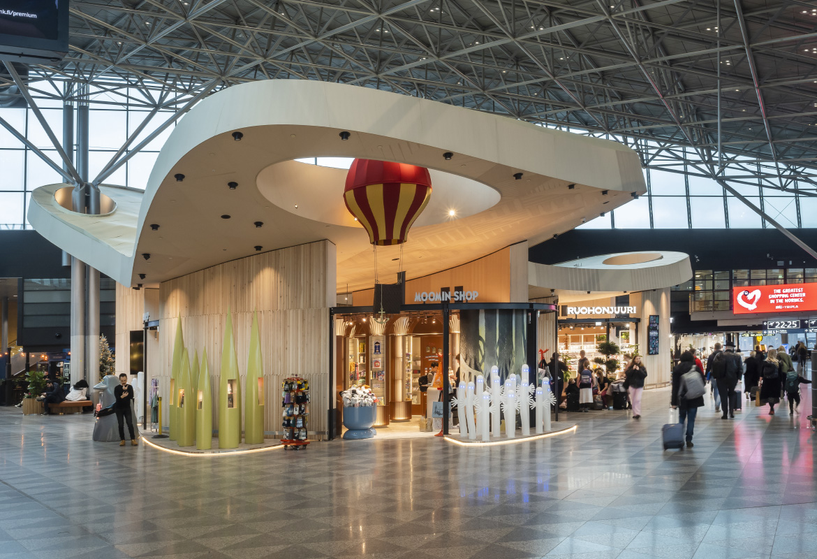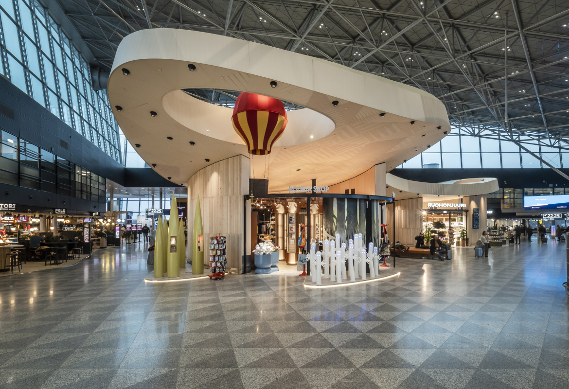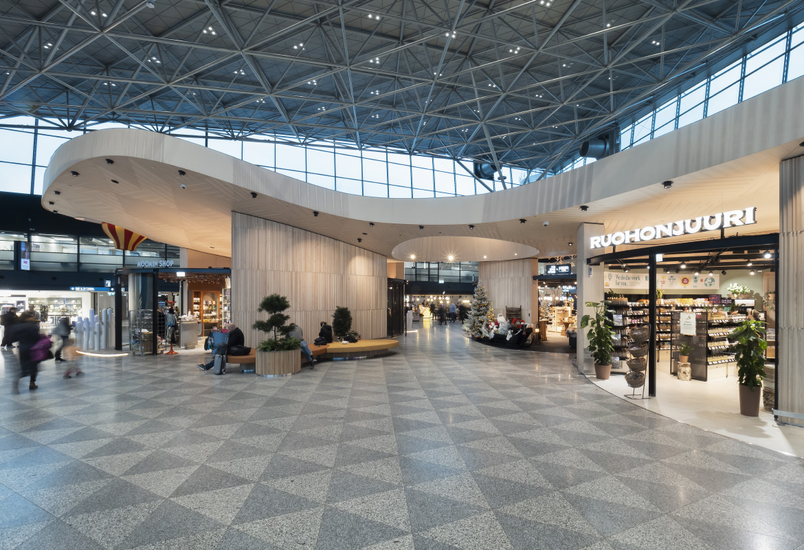 A welcomingly lit timber retail unit stands at centre of the hall, forming a striking sculptural landmark on the main passenger route. Built of steel, softwood timber and plywood, the organic form is inspired by the chanterelle mushroom, considered a great delicacy in Finland and foraged from the forests.