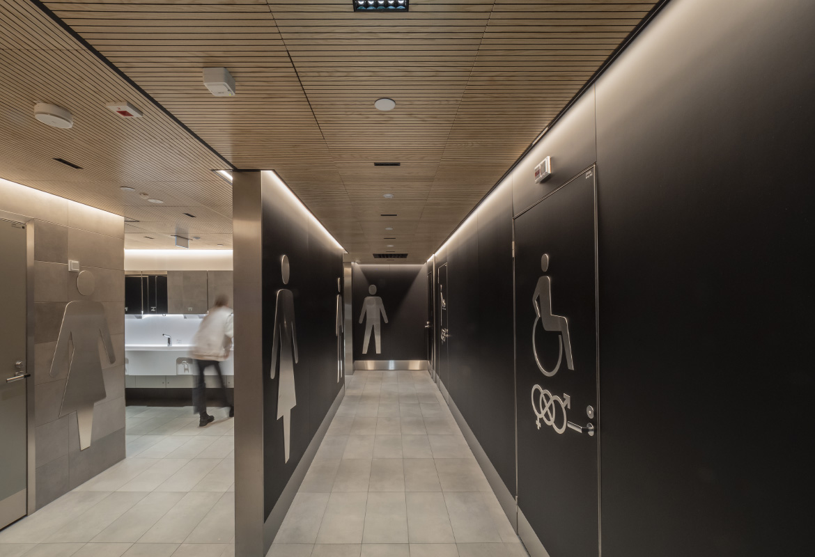 Further retail facilities are located around the hall. Upgrades also included new passenger amenities including restrooms, as well as signage for wayfinding.