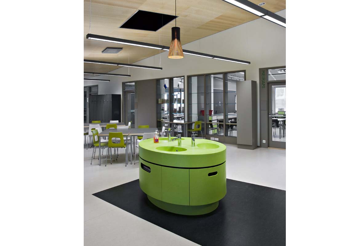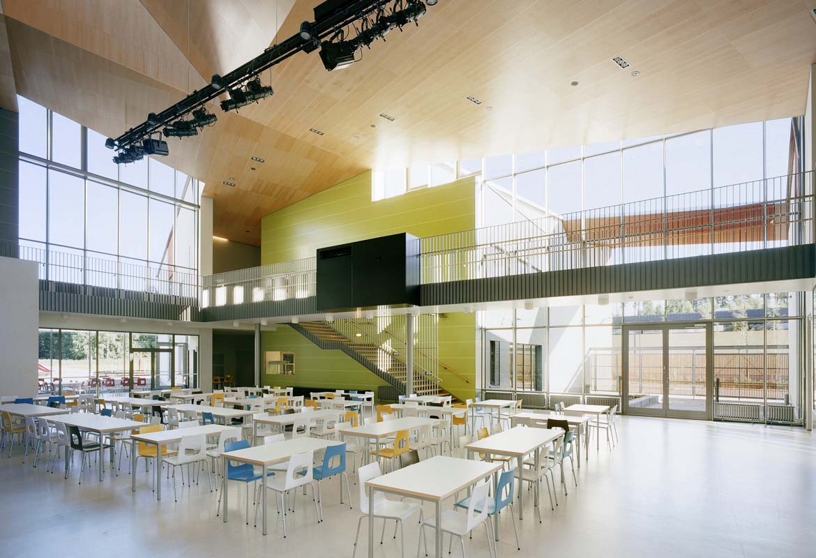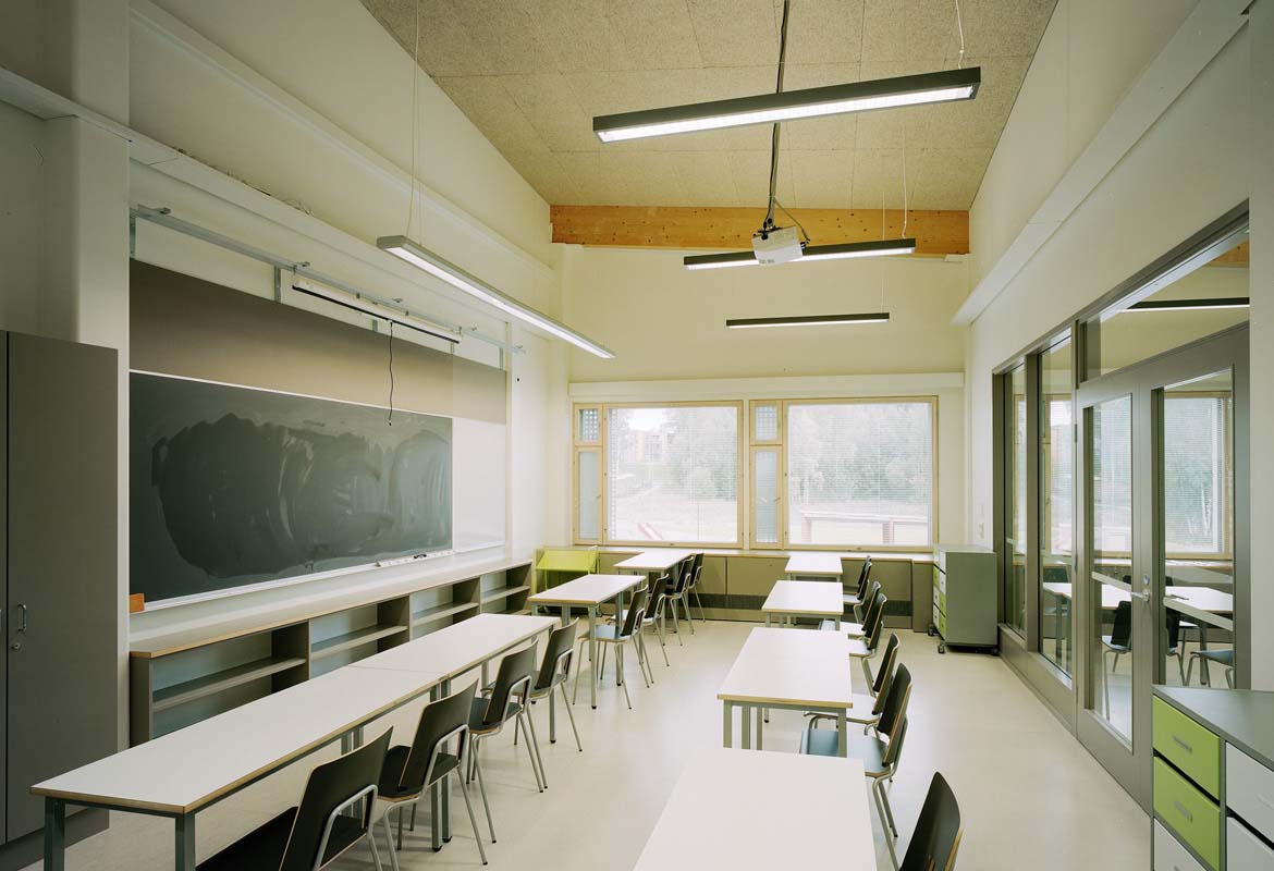 Additionally the school is arranged in a way that is very efficient. The amount of corridors have been minimized and all facilities are located close to the central hall which can be used for dining and festive occasions. Even though the building integrates many advanced technologies the architectural language is not technical.