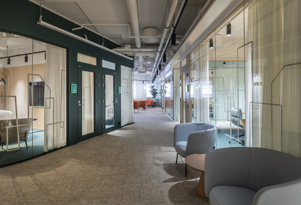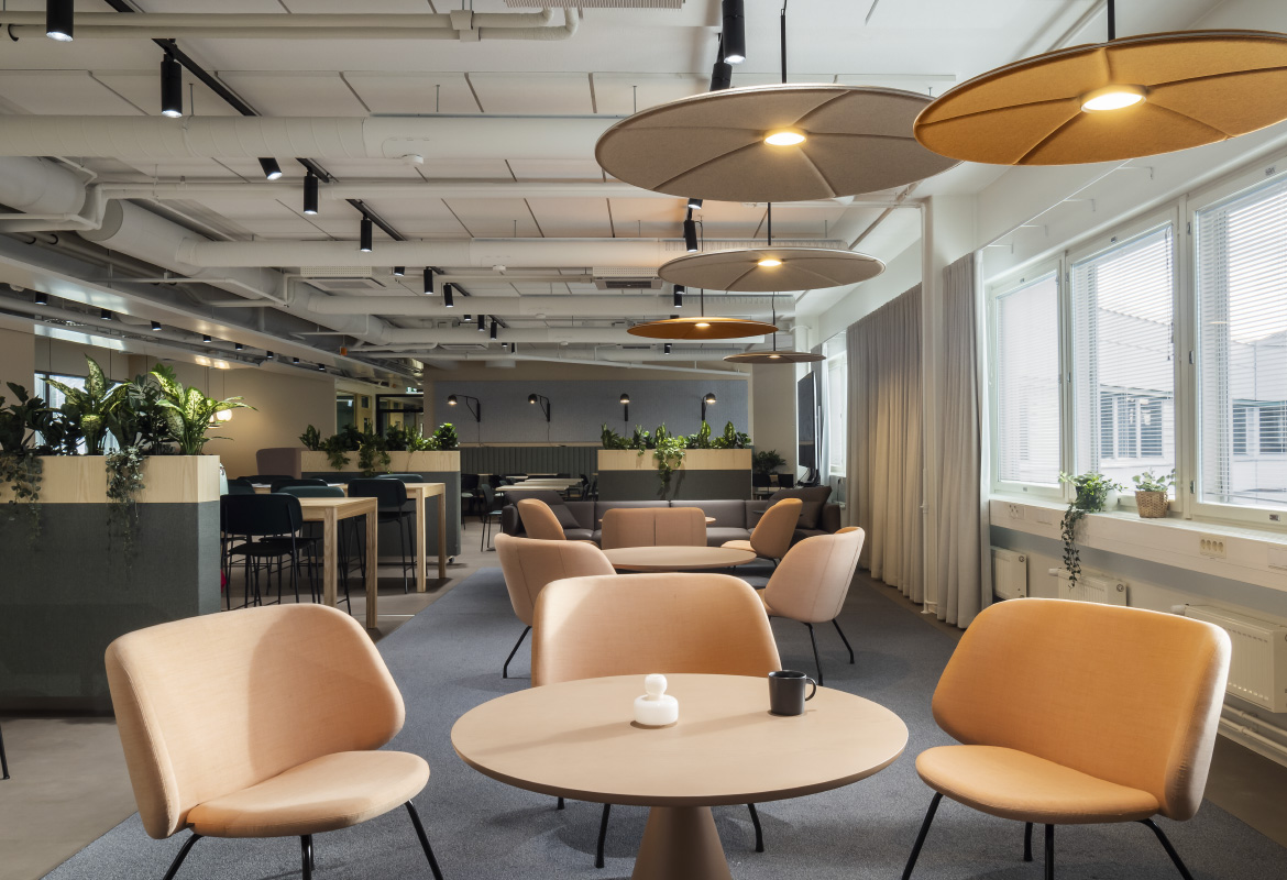 Retta Group Oy flexible office spaces were designed to serve different needs in varying forms of work. Retta’s brand colors were reinterpreted in the color scheme of the interior.