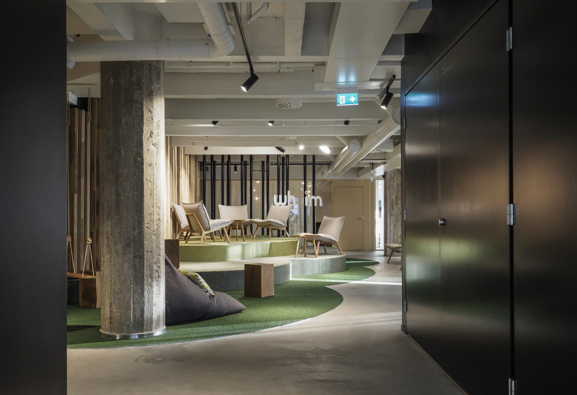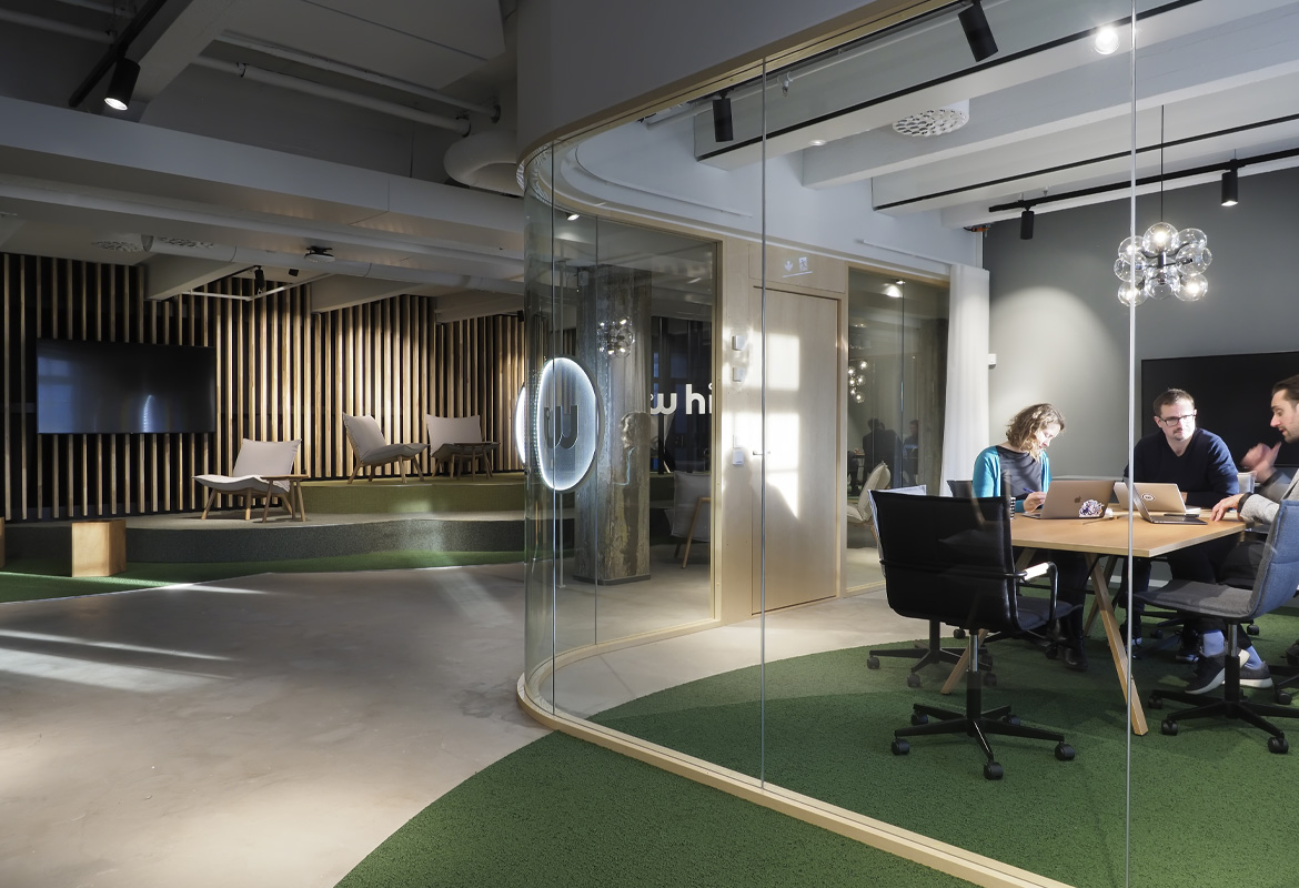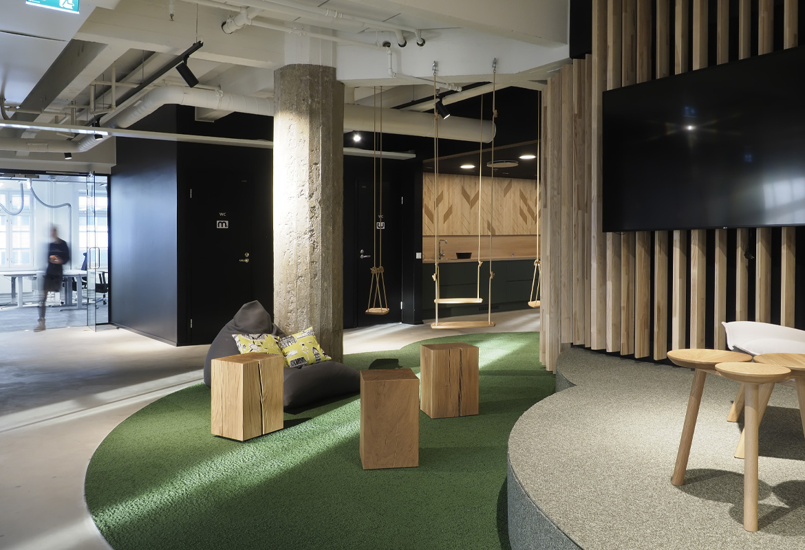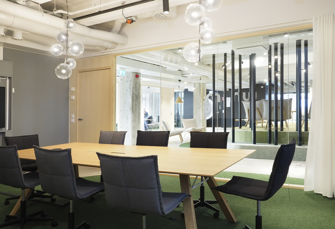 The company creates solutions for sustainable shared transport services, so a natural feel was sought in the interior design through colours and materials. The office has a modern yet homely ambience. The heart of the office is the Green Lounge, a meeting place that also functions as a social media studio and presentation space. The windows towards the atrium are covered by a slat wall that acts as a unifying element. Natural light floods the office through south-facing windows.