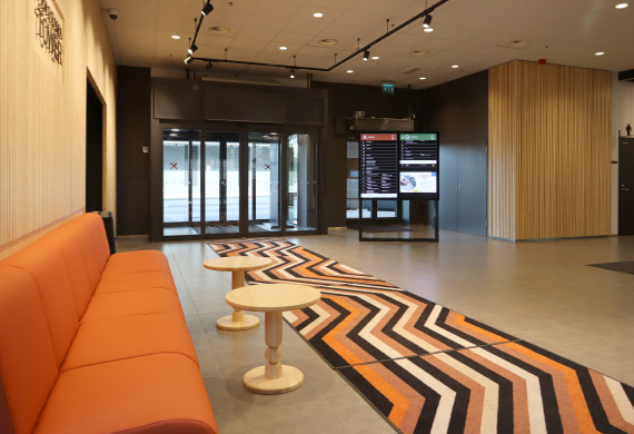 Graphic elements in a building and its interior can serve a range of functions from guidance to decoration. Signage and maps are vital for wayfinding particularly in public areas such as transport terminals, theatres or large office lobbies, but can also enhance the interior environment and convey the client’s brand image. Logos and other graphics are an integral part of an organisation’s image and visual identity. Graphic design can also be applied to decorative elements such as wall panels and taping.