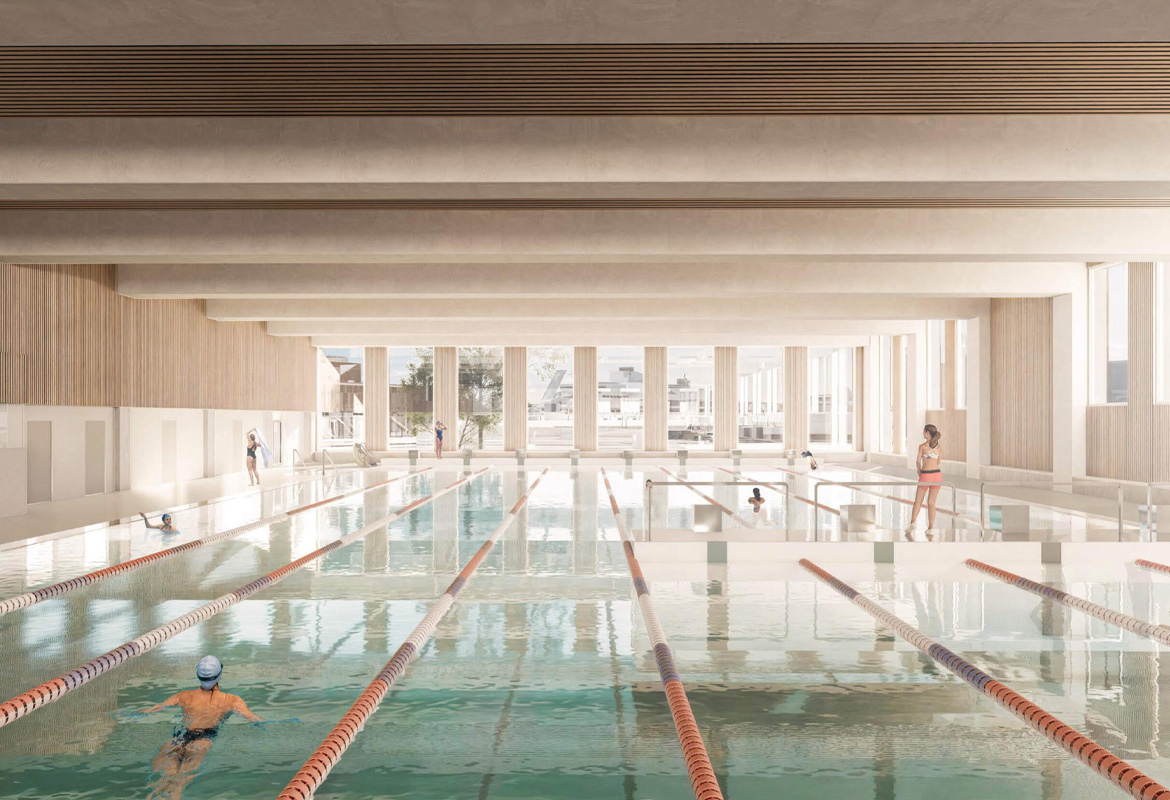 Water exercise: A 50-metre swimming pool, a wading and children’s pool, a diving tower and cold pools, and a teaching pool with adjustable depth. A wellbeing pool area will include massage stations, a jacuzzi and a water play area.
