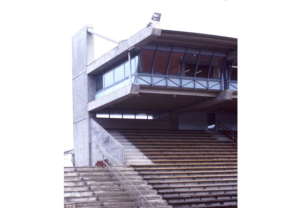 In addition to hillside spectator stands a new grandstand was designed with seats for 5350 spectators. The grandstand seats are partly covered by placing above them the facilities for commentators, press and officials. By this arrangement a wide view towards skiing tracks has been obtained. This cantilevered topmost level is supported on concrete columns with pre stressed steel tension bars. All load bearing concrete and steel structures are "cold" structures.