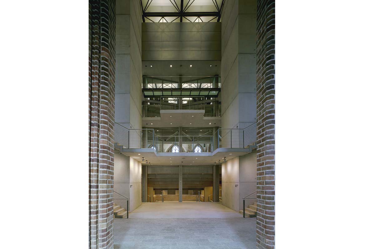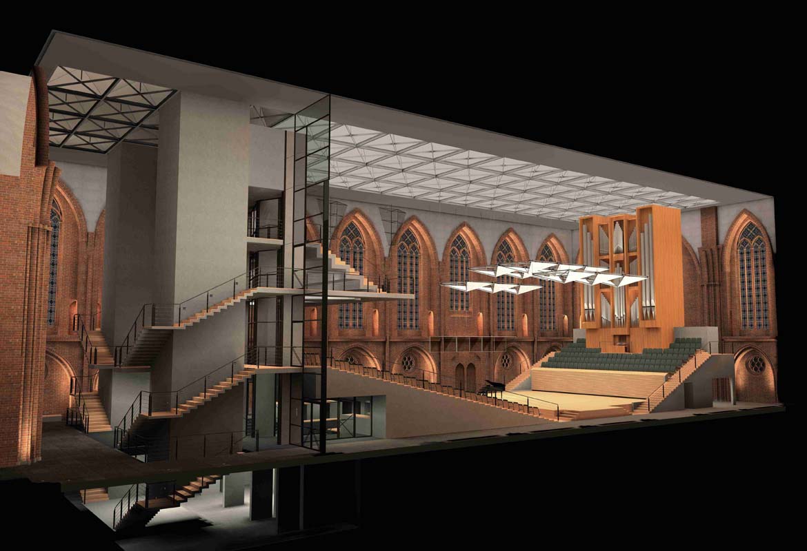 The town of Neubrandenburg decided to convert the ruined church into a concert hall and restored and renovated it in the 1980s and 1990s. The full load of the roof was transferred to the exterior walls using steel frames, freeing up the internal space from columns. The implemented plan was based on PES-Architects’ winning proposal in the invited European architectural competition arranged in 1996.