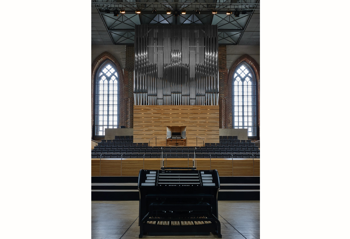 An organ was designed for the concert hall during the main construction phase and a technical space was built for it under the choir balcony, but the original budget did not allow for its purchase. It was not until 2015 that the organ project could start, thanks to a local sponsor. As the original designer of the concert church, Pekka Salminen was also the chief architect of the new organ design, working together with Johannes Klais Orgelbau and Karl Schuke Orgelbauwerkstatt. The new 70-register organ, weighing 21 tonnes, was inaugurated in July 2017. The massive lower base is of ash and the organ pipe facade is of tin and stainless steel.
