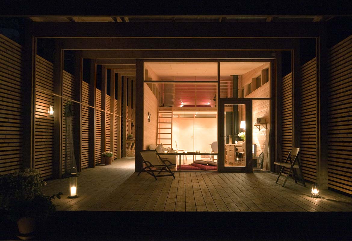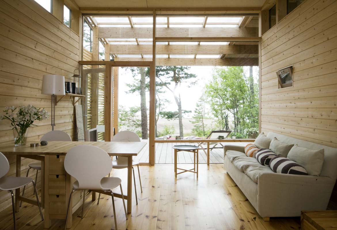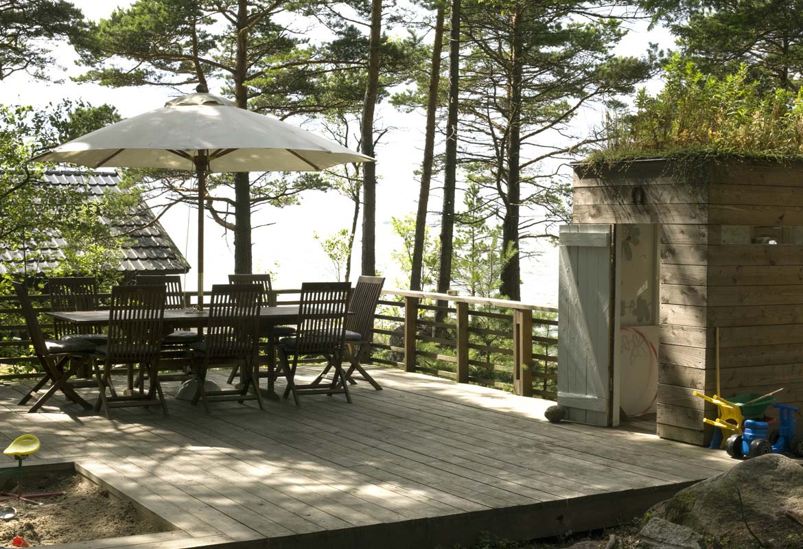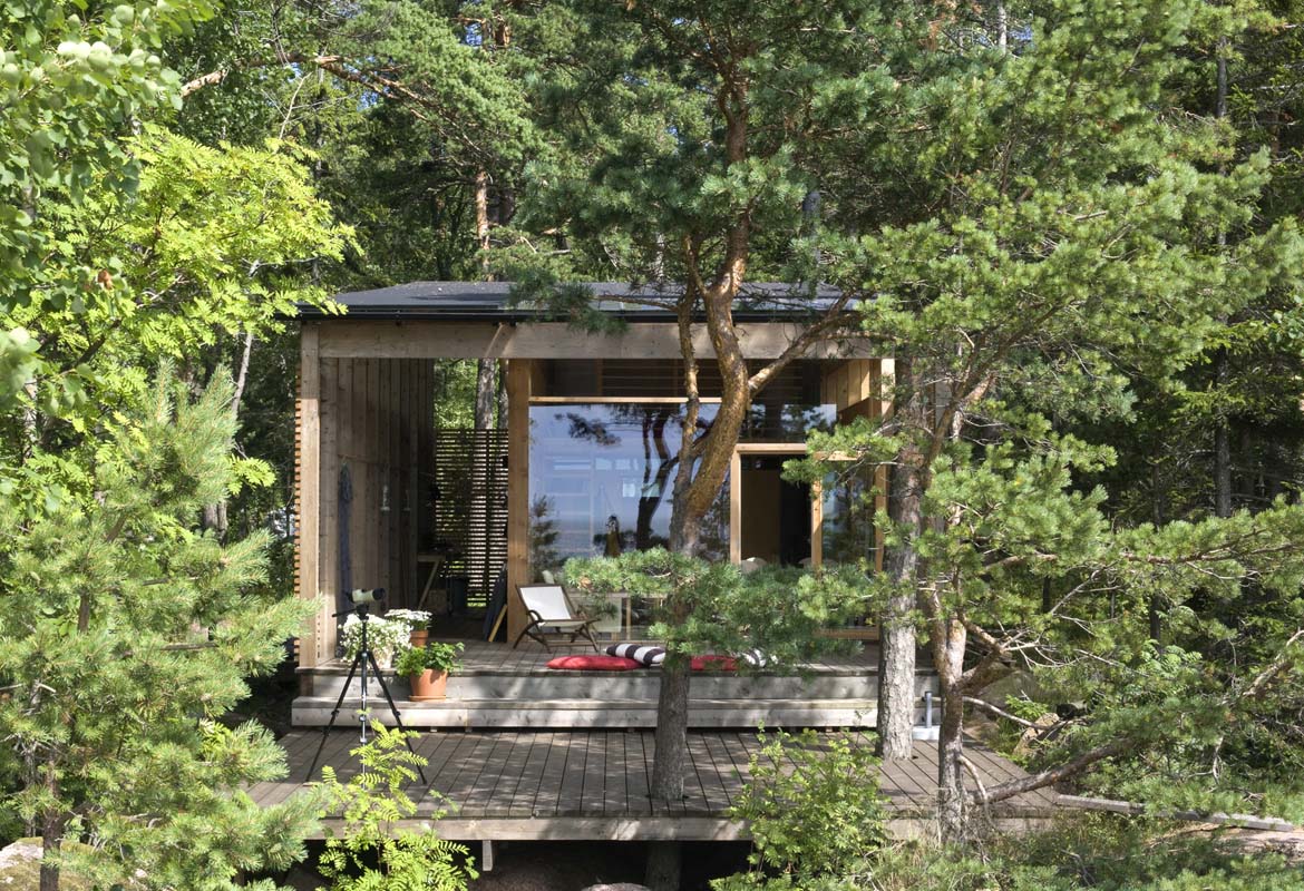 This little cottage is one of a group of buildings used by three generations of the same family. It is set in a rocky hollow beside the open sea, right on the edge of the forest. The group of buildings is linked together by a shared terrace and a turf-roofed playhouse in the middle of the central courtyard.