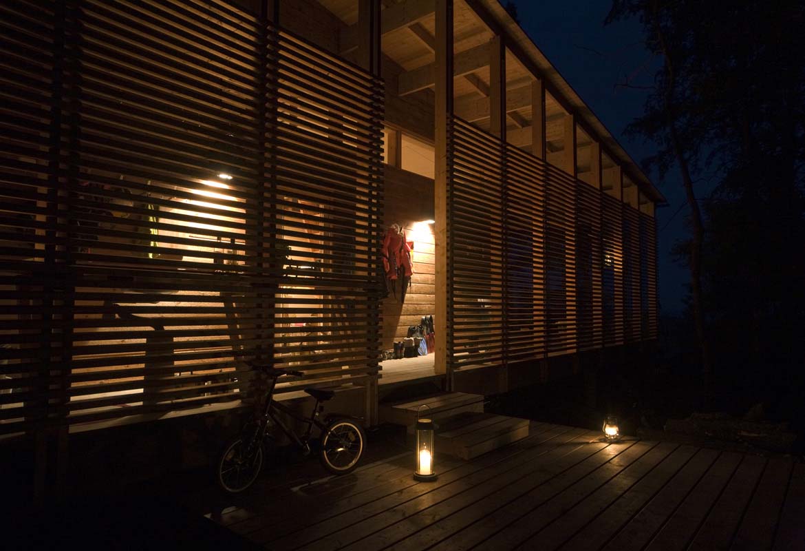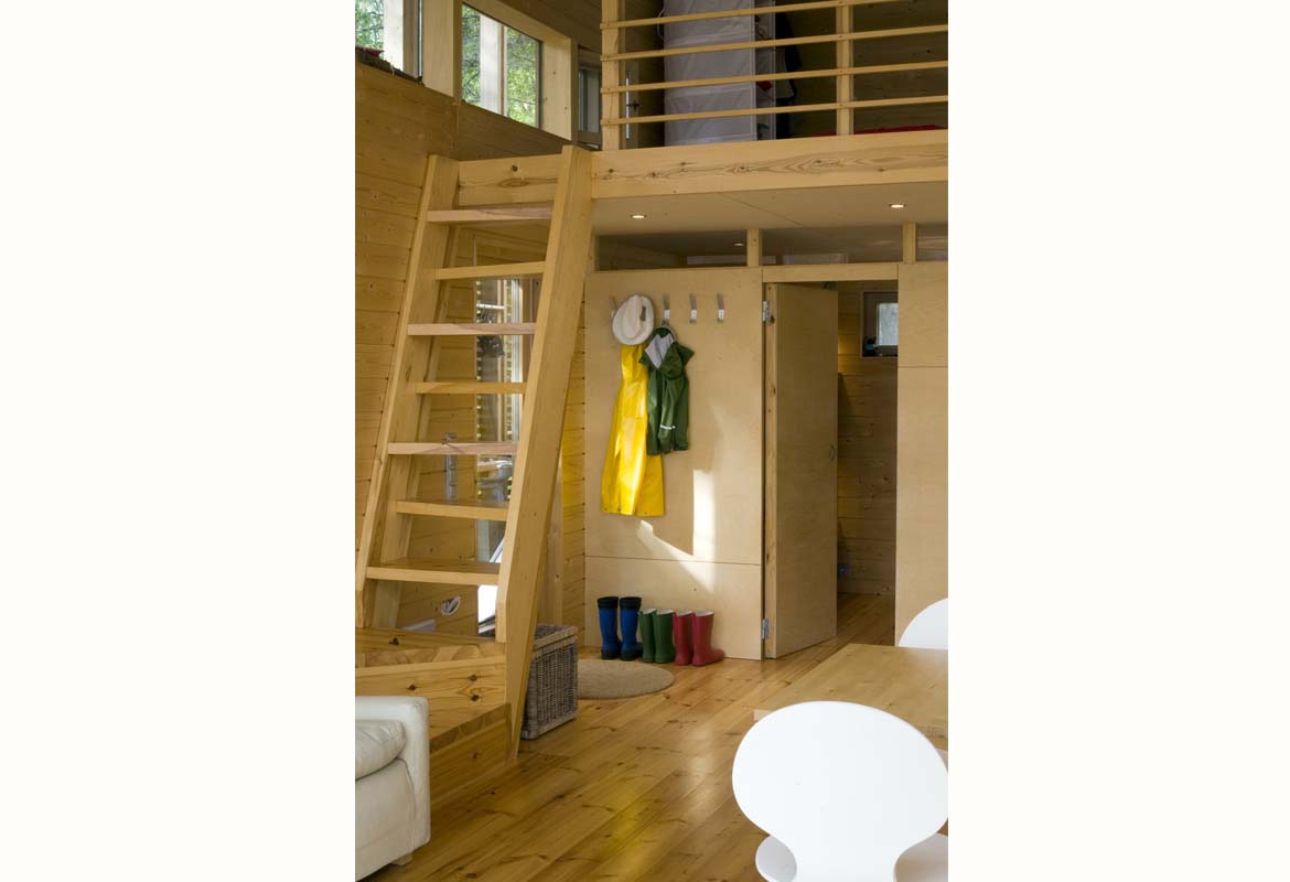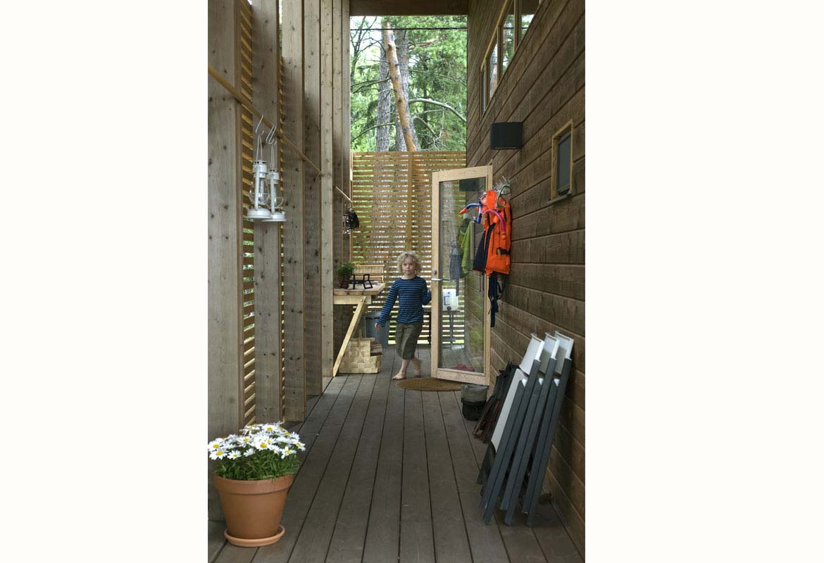 The wedge-shaped section of the small building gives enough space to sleep a family of five in the cabin-like bedroom with its high-level balcony. In relation to the amount of interior space there is a large quantity of covered exterior space for summer holidays. The terrace, with its sheltering pine-batten louvers, is used for untangling fishing nets and for preparing food, always most enjoyable done out of doors.