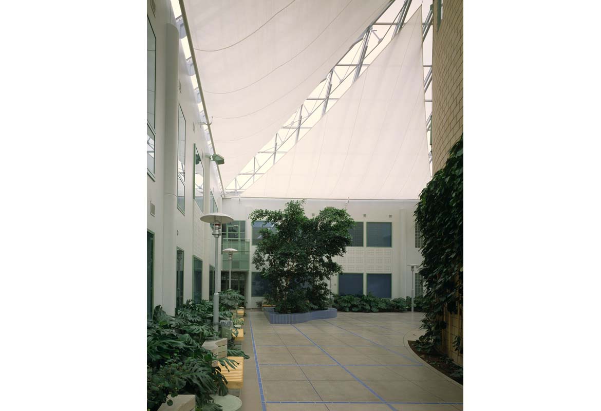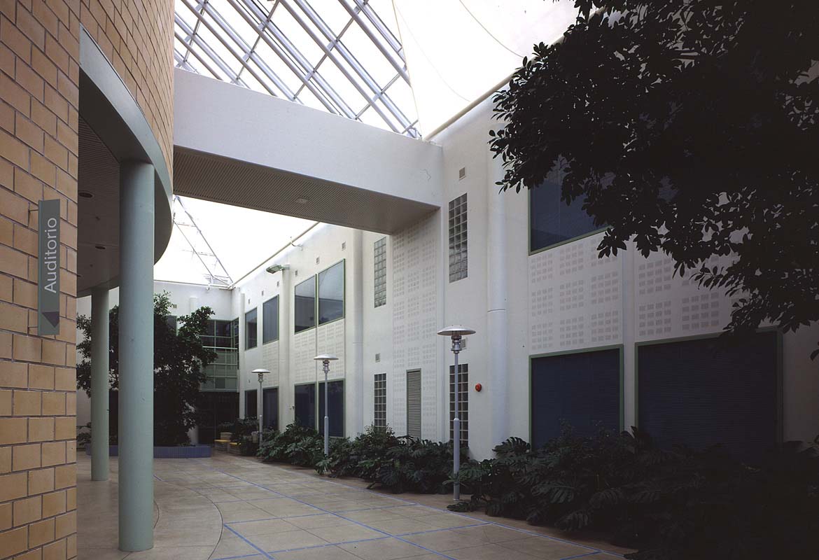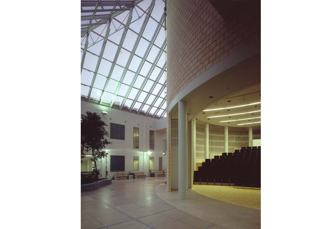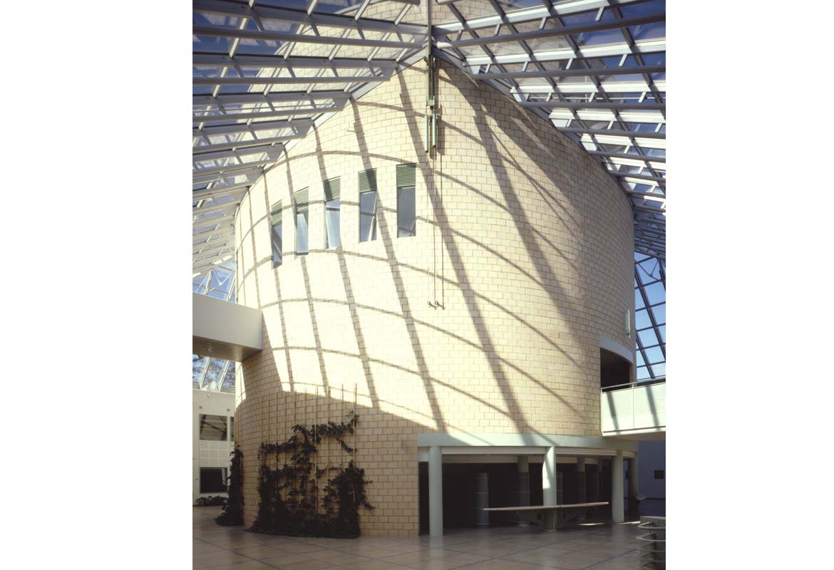 The auditorium, seating 250, is in the middle of the courtyard, which has been made into a glass roofed lobby. The lobby skylights have internal, triangular shading sails. They can be "reefed" around the rotating axis like a foresail. The garden court atmosphere of the lobby has been created using lamp-posts, extensive planting and choice of materials. The lobby and central auditorium underline the nature of the institute as a public building which can also be used for other than educational purposes. With the use of sliding walls, the auditorium can be joined to the lobby, creating a space for bigger public occasions.