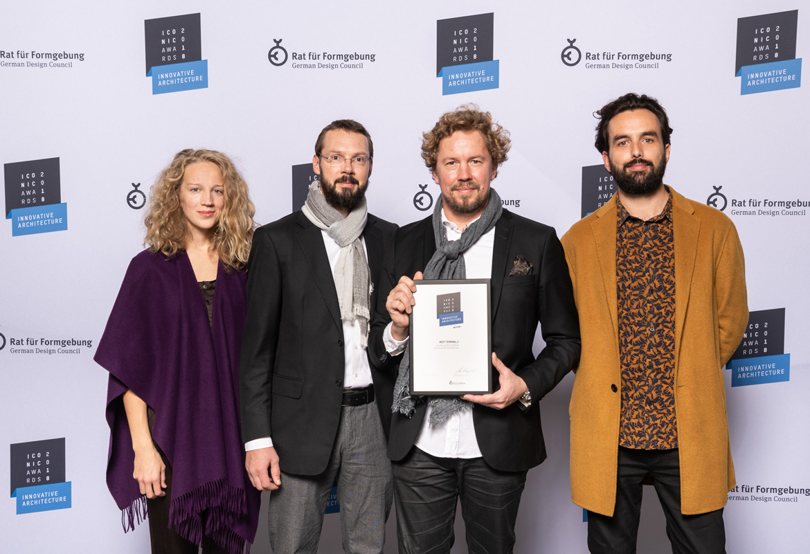 West Terminal 2, Port of Helsinki, was awarded as an ICONIC AWARDS 2018: Innovative Architecture Winner at the awards ceremony on 8 October 2018 at the Pinakothek der Moderne gallery in Munich. The award, published in August, was accepted by architects Tuomas Silvennoinen (chief designer), Pekka Mäkelä, Hanna Eskelinen and Emanuel Lopes of PES-Architects.