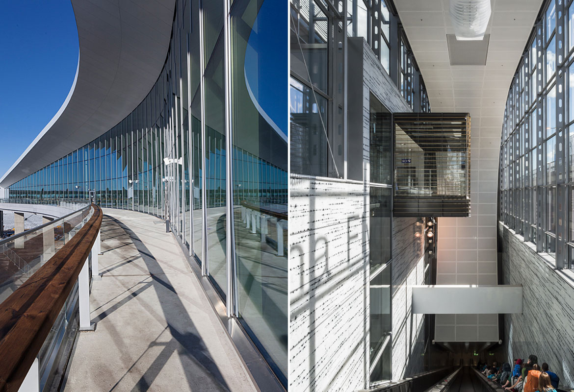 The underground Airport station of the Ring Rail Line, completed in 2015, connects the airport to the centre of Helsinki . In the jury’s words, “The best airport experience offers a coherent sequence of transportation episodes that cover the whole journey spanning from home base to the aeroplane speeding down the runway. The Helsinki Airport Railway Station fulfils expectations as the pinnacle of the rail journey and the overture – as well as the final cadence – to the flight. The architecture relies on the impacts of the electrifying sensation of arrival and the scale of the episode that spans from the underground platforms to the ground-level entrance points.”