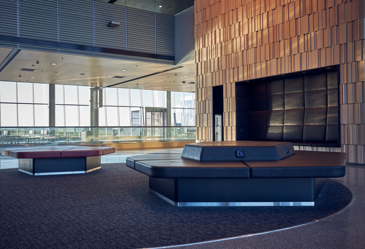 The core of the new area is the double-height central plaza, designed as an oasis of calm and refreshment for weary travellers. The triangular space is encircled by a 75-metre-long and 2 metre-high LED screen displaying a changing Finnish landscape in different seasons. The immersive experience is enhanced by lighting and sound effects and the birch-panelled walls act as an interactive touch screen. The installation is a collaborative effort by OiOi Collective with Granlund Oy, based on a concept by Davidsson Tarkela Architects and Rune & Berg Design Oy.
