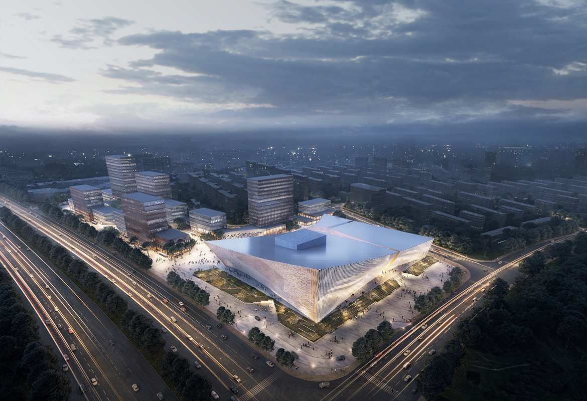 PES-Architects' winning design is a metaphor of the massive ice blocks that form on frozen Finnish lakes and sea in winter. The project is a 210,000 m2 hybrid development, incorporating a hotel, offices, commercial, exhibition and multipurpose spaces, and will serve as the focal point for the residents of Nanjing Southern New Town. The project façade concept follows the project metaphor of frozen ice. The glass sheets of the undulating double skin façade are patterned with a printed solar-collecting ice crystal design. This façade, designed in collaboration with VTT Technical Research Centre of Finland, is based on printed organic solar cells. The functional facade will not only be a pilot project architecturally, but more so philosophically, as it suggests a future where solar energy can be collected from all kinds of surfaces.