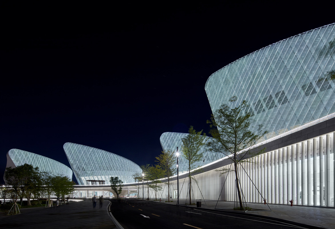 The five double-curved main façades are made of 42,250 lens-shaped ceramic louvres, maximizing the shading capacity of the façade and creating a translucent “jasmine white” skin for the building. After dark, the interior bamboo wall creates a deep secondary façade layer behind the white ceramic screen.