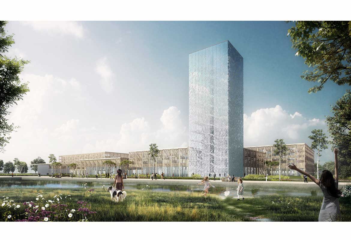 The scattered organisation of the glass pavilions allows for a porous overall structure that permits nature to creep in. Glass passages form a network of connections, providing picturesque and generous circulation routes through the building complex. The spaces between the pavilions are animated by series of lush garden terraces and water features. On warm summer days, the lobby and other spaces can spill out onto the adjoining terraces.