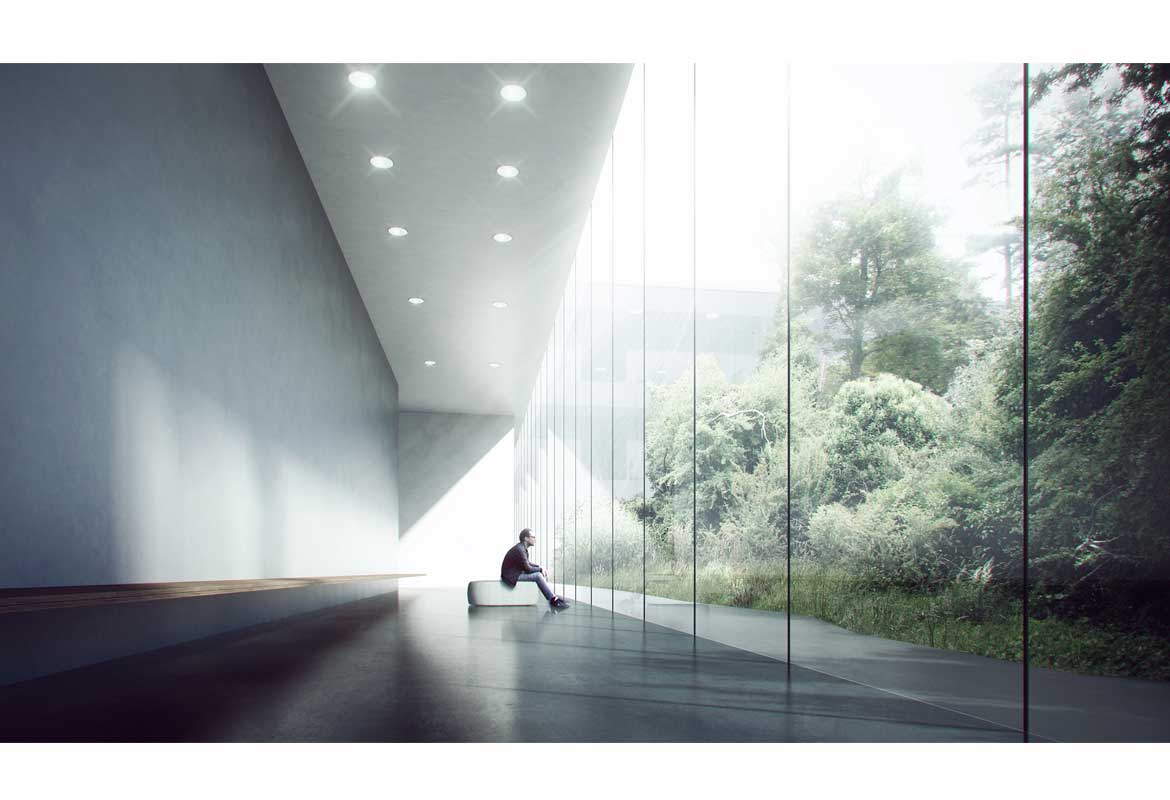 The facades have been designed to give visual unity to the building and allow bidirectional views from and to the art centre’s spaces, promoting visual integration of the new building to the existing site structure. The architecture is characterised by a sense of lightness and openness, allowing daylight and breeze to permeate the building. The pavilions are clad in a gradient pattern silk-screen printed glass which reflects the surrounding forest, creating a constant flux of hues and intensities. A forest of hybrid wood-steel pillars and a lamella of wooden shading devices create an extended, permeable 4-metre-wide façade zone. Partitions of the façade can be opened during the warm season to allow the direct flow of people and functions, further blurring the threshold between indoor and outdoor.