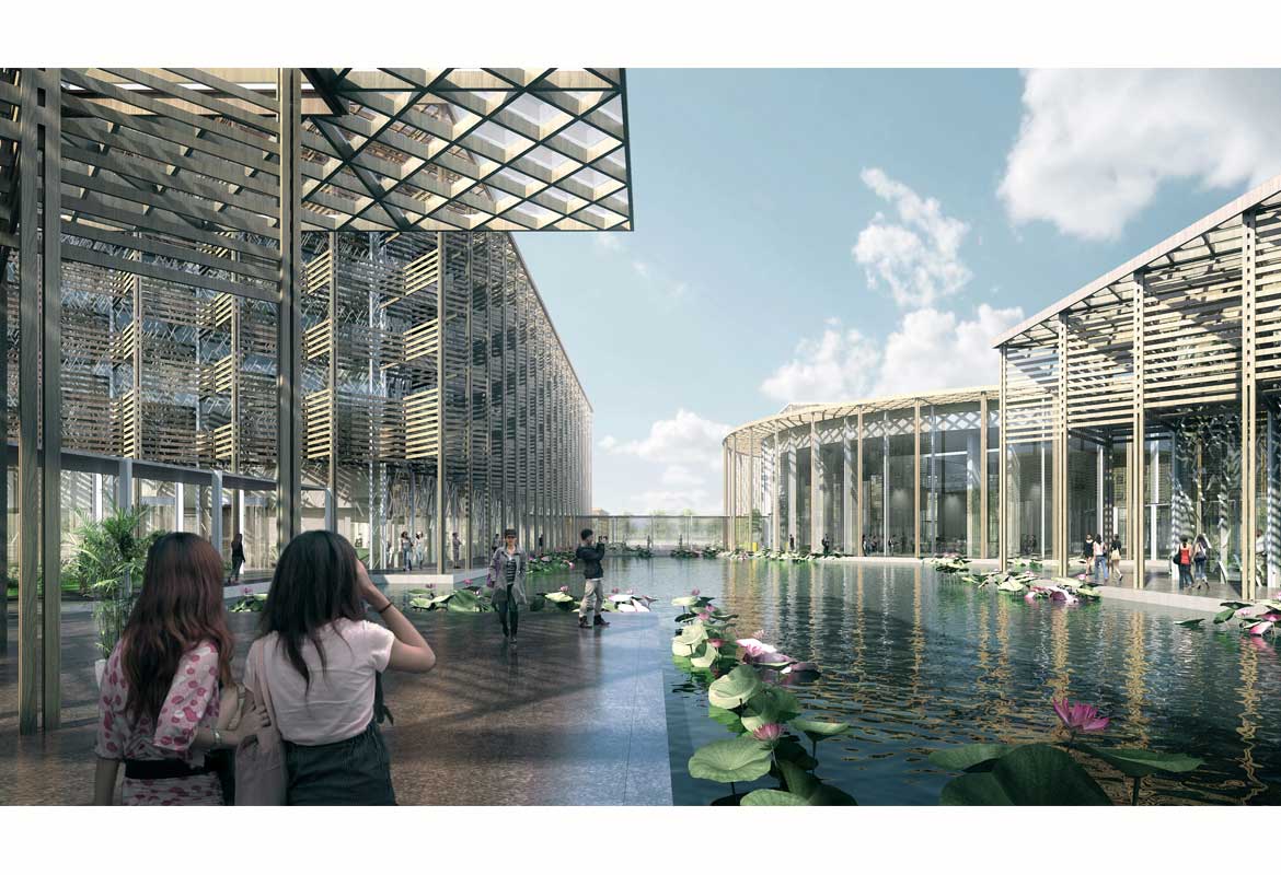 The Shanghai Nine Trees Art Centre functions as a core for the creation of a porous city border. The outlines of the building are designed so as to complement the existing built environment, creating urban spaces of variable scale and nature. The form and internal organisation of the building opens towards both the city and the forest and allows connections to and from all directions. In the spirit of a ‘cultural campus’, the layout creates an intertwining network of various functions, buildings and green spaces that can accommodate a rich variety of uses and users. The existing forest and its wetlands will be extended to the site of the art centre as pools and greenery, intertwining with its pavilions.