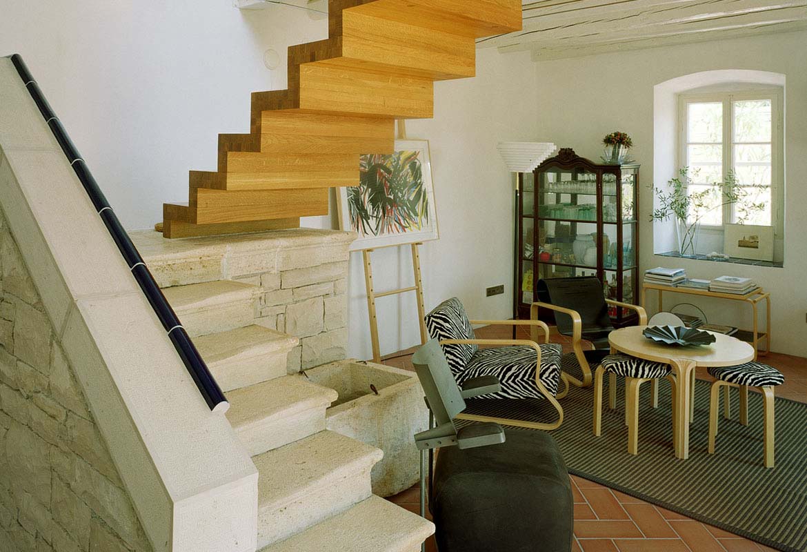 The interior was entirely remodelled, with modern conveniences and sleeping for eight, and furnished with a blend of modern Finnish and Italian as well as some original Unije furniture. The ground floor and sauna area feature Tuscan Imprunetta terracotta floor tiling.