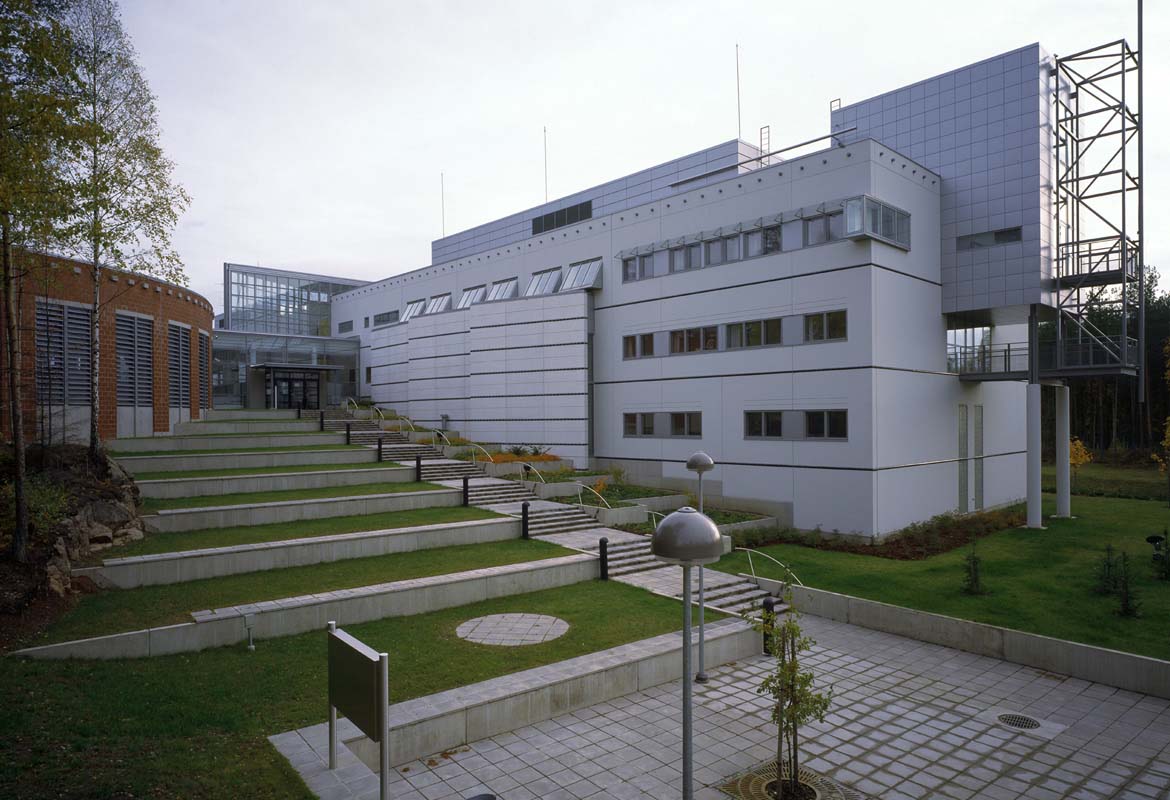 The site is split into 2 parts, one containing the teaching facilities and residential buildings to the west along Tieteenkatu and the other to the east containing the training tracks and drill grounds. The western area of the site is oriented around a park like depression in the centre. The new halls of residence form an arc following the contours of the hill to the north east.