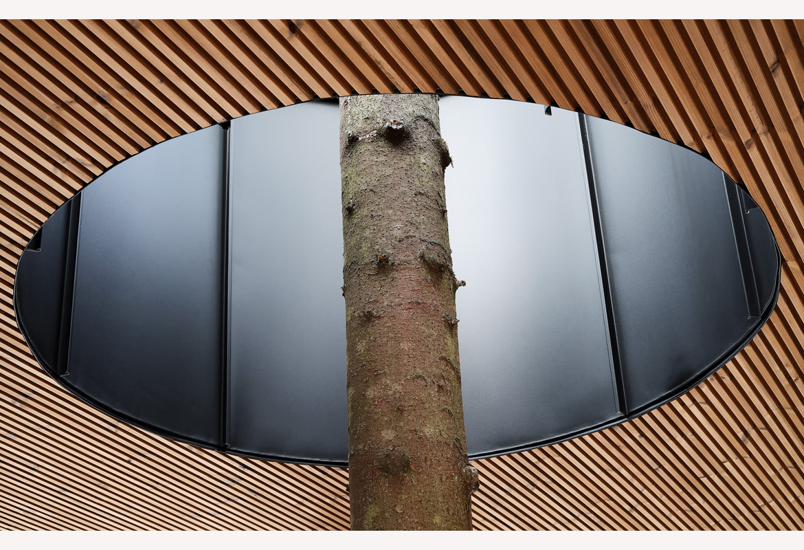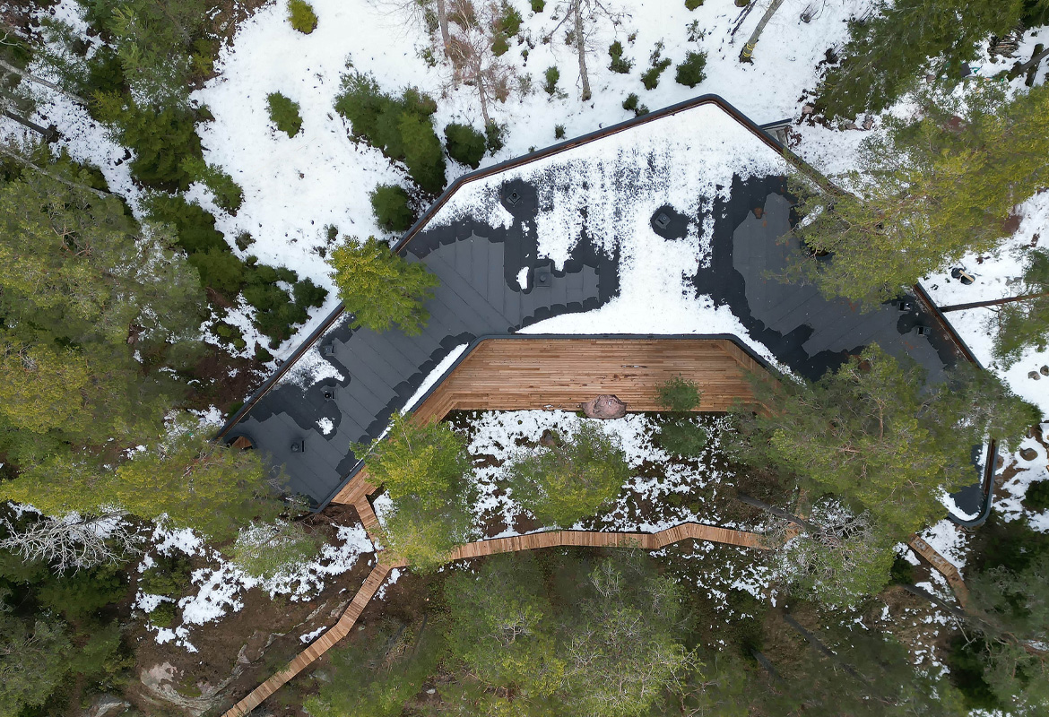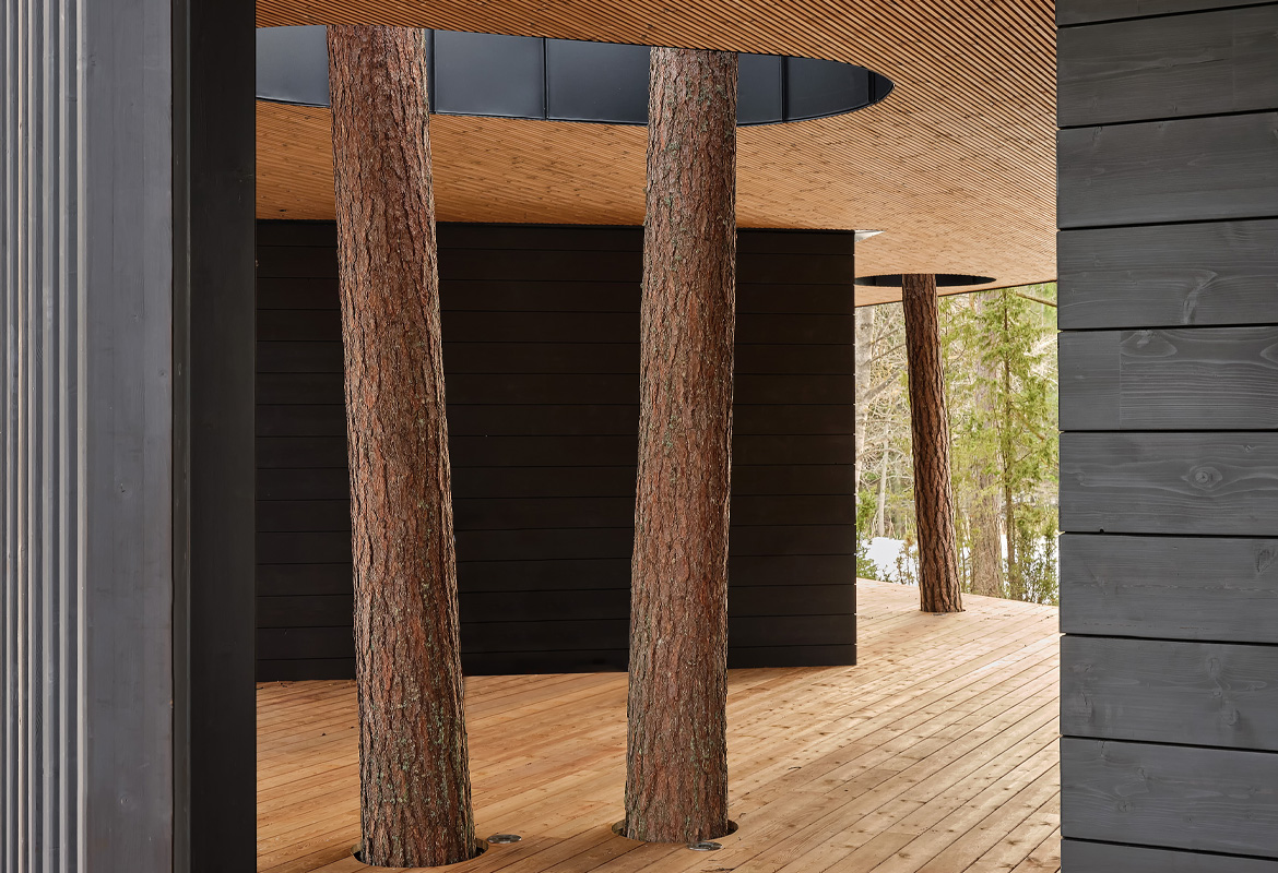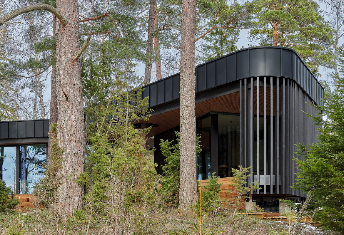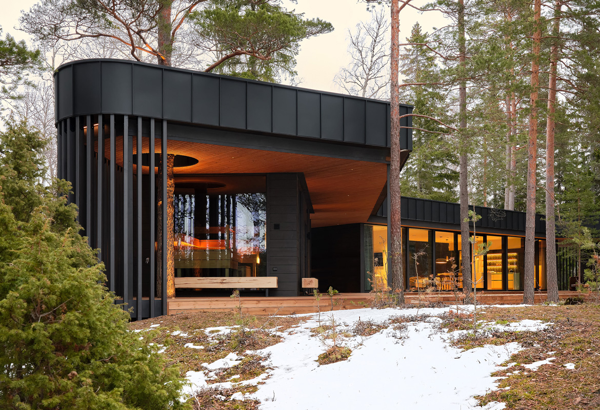 Villa Bumeran sits in Kirkkonummi on the southern coast of Finland, its architectural form evoking the elegant curve of a boomerang, gracefully embracing the wooded landscape with its arched shape. The vision of the boomerang shape was introduced by the client. The shared goal was to blend the timber villa into the natural environment and preserve the untouched nature of the lot as far as possible.