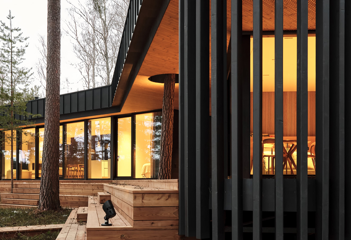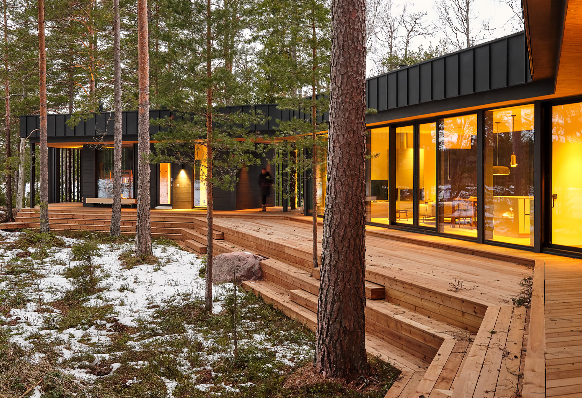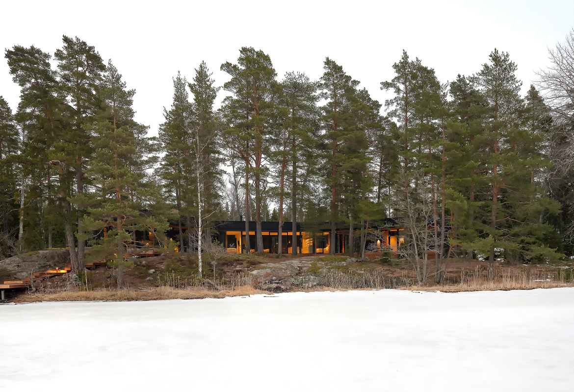 Comprising three distinct areas—the main living space, sauna, and guest room—joined as a single entity around the wide, curved terrace, this wood-structured villa is adorned with natural wood finishes. The use of materials aims to evoke a warm and inviting atmosphere, embracing the timeless aesthetics of classic Finnish design. The interior was designed in collaboration with interior designer Esko Saarenoja.