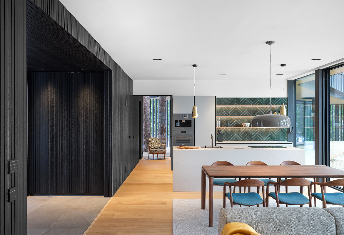 The design focuses on seamlessly integrating living spaces with the natural surroundings, establishing a harmonious connection between the two realms. Employing purposeful architectural elements, the villa incorporates openings that accommodate the existing tall pine trees on-site, none of which were felled during construction.