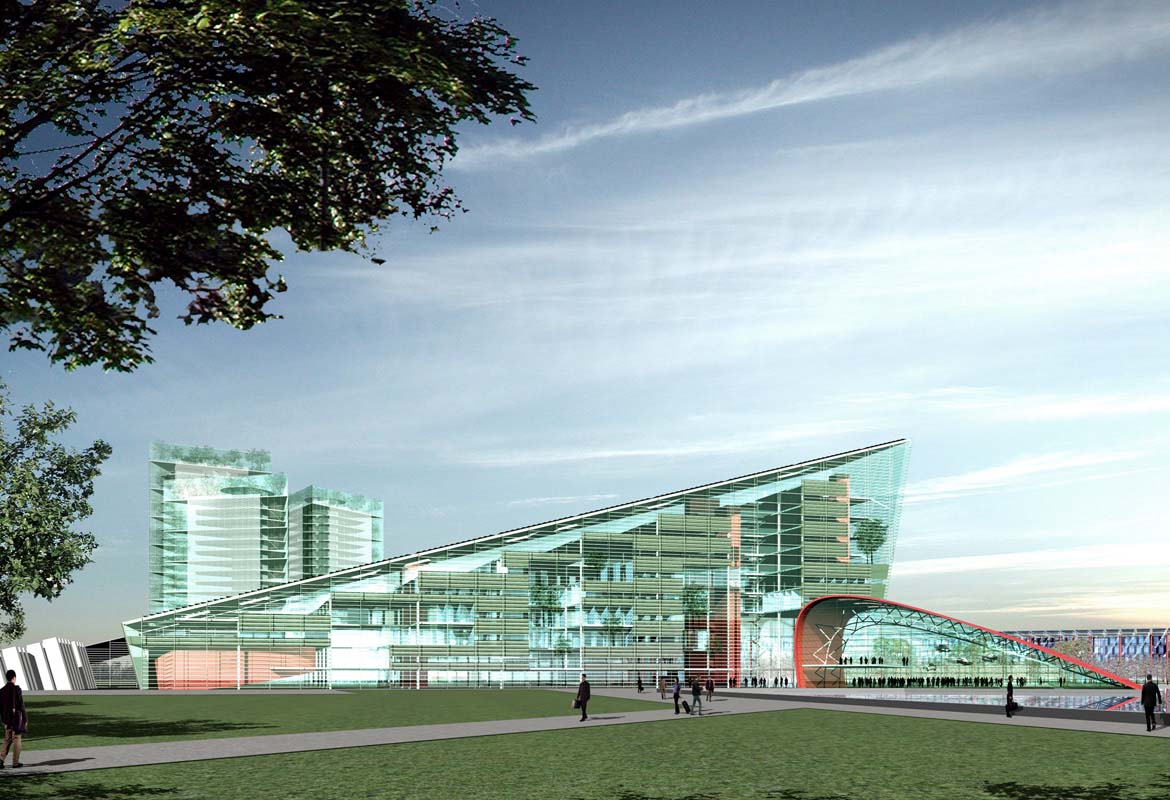 In the architecture of the DongFeng automobile company’s new headquarters the strength of the Chinese car industry is emphasized by its dynamic forms. The complex which is dominated by a wedge shaped headquarter building also contains an exhibition centre and a research centre.