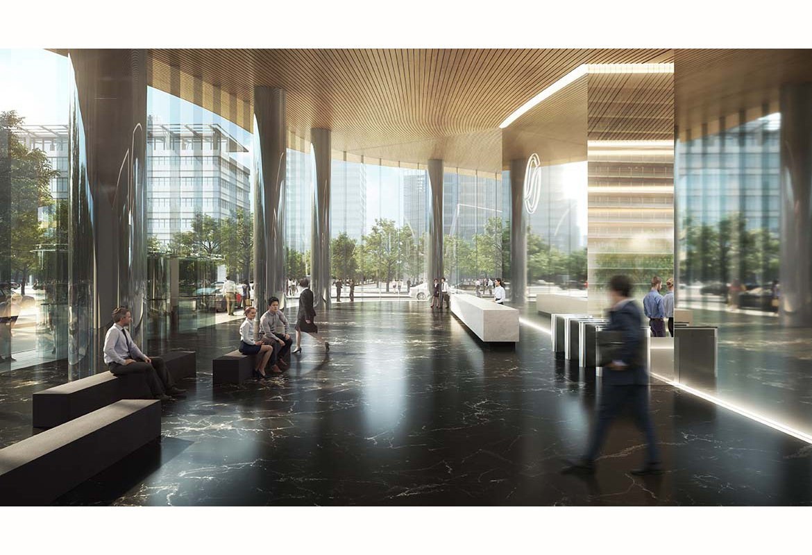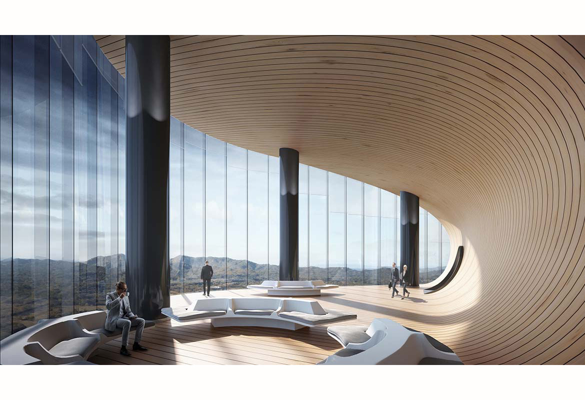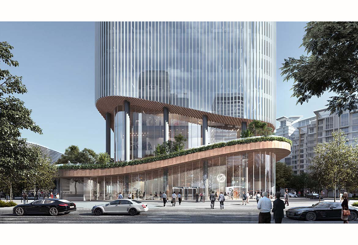 The same wave shape lifts the building at the bottom to form an open and dynamic commercial space. The atmospheric ramp extends through the glass interface to the road, attracting people from the Civic Square into the building. The ramp inside the building winds upwards around the core tube, leading the flow of people to stroll through the indoor and outdoor commercial spaces to the shared office space, enjoying the range of services and activities on offer on the way.