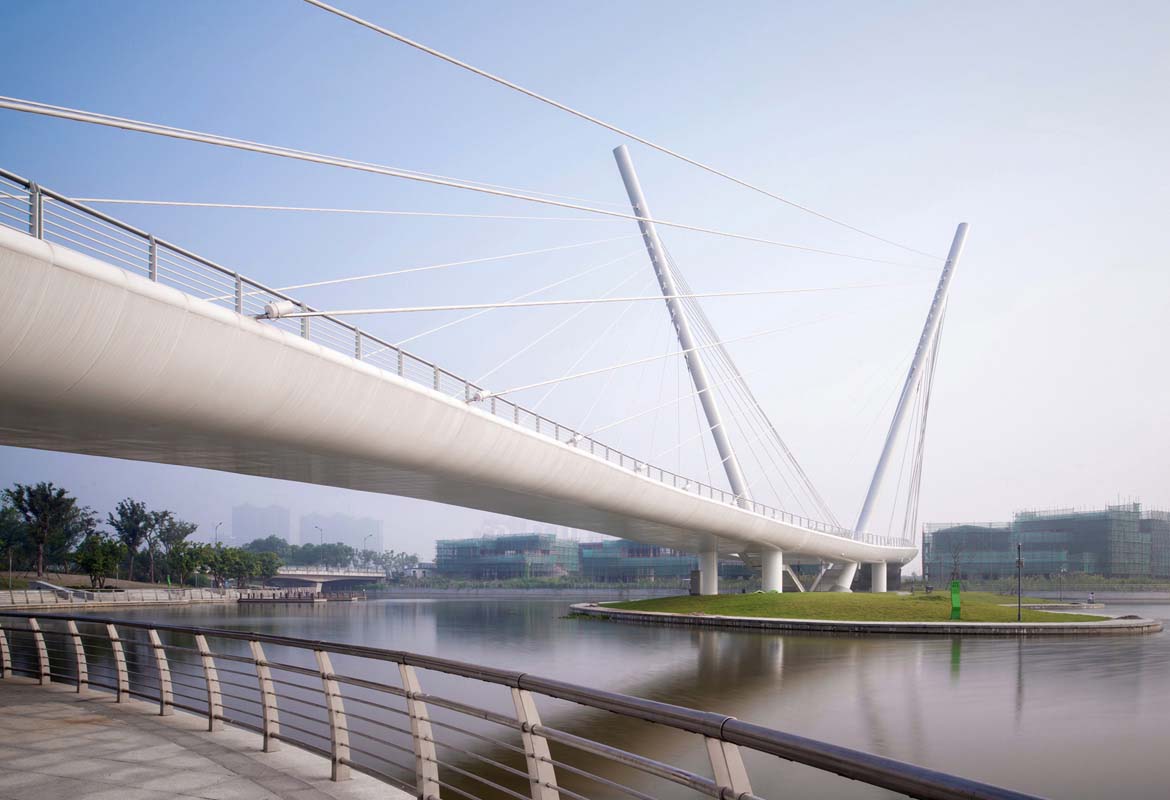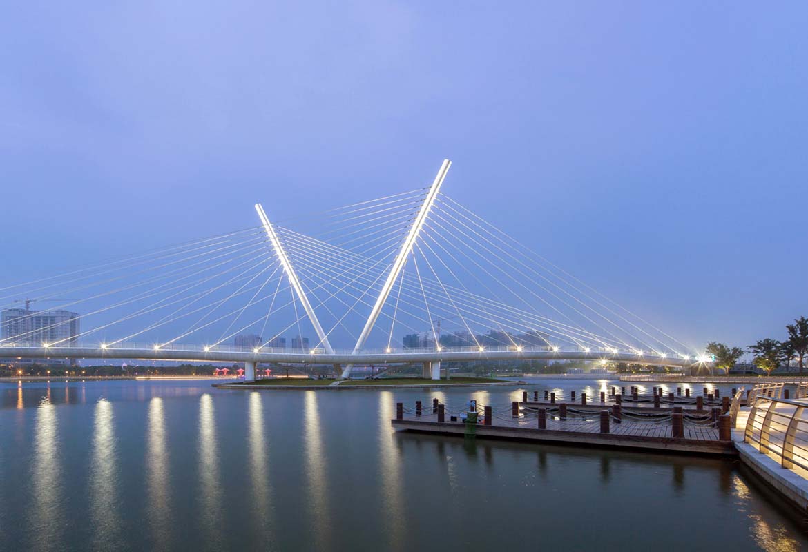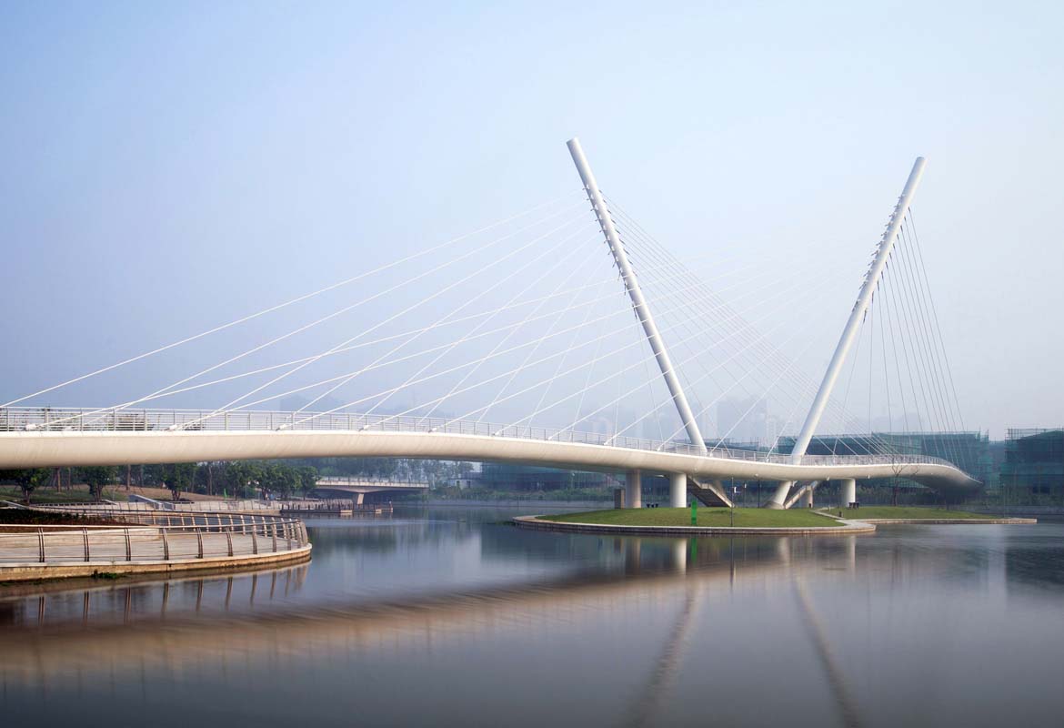 Done in collaboration with WSP Finland the Wuxi Xidong pedestrian bridge links two sides of the Xidong Central Lake. The main visual element of the bridge is two independent oppositely inclined pylons, with a fan of cable-stays, between which is suspended an undulating deck structure. The pylons are founded on a central man-made island accessed by two sets of stairs. The concept for the bridge was inspired by the image of a loving couple dancing.
